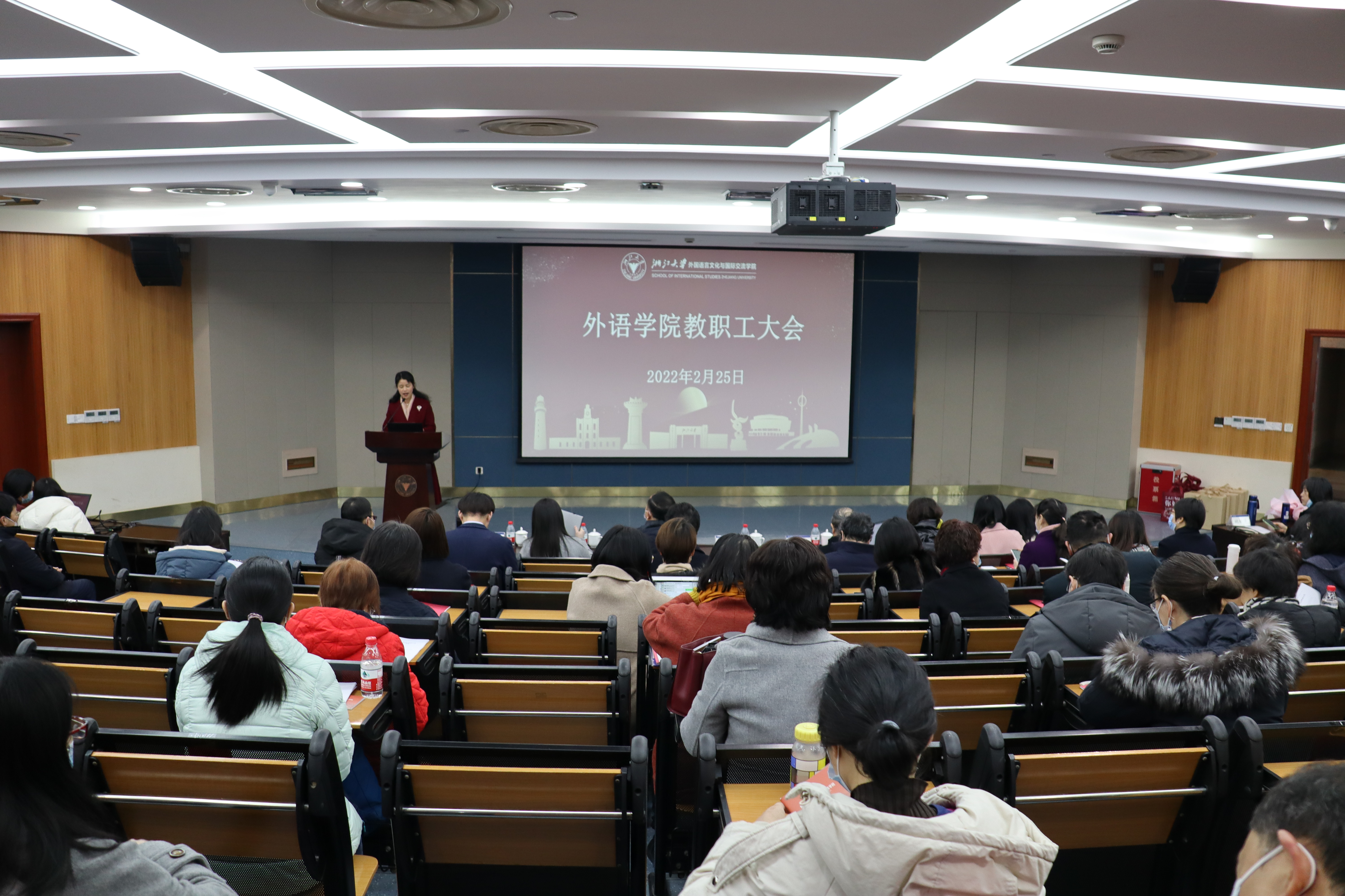 2022年2月25日,外语学院在蒙民伟楼138报告厅召开全院教职工大会。学院党政领导班子全体成员、全体教职员工参加会议。会议由学院党委副书记费兰兰主持。