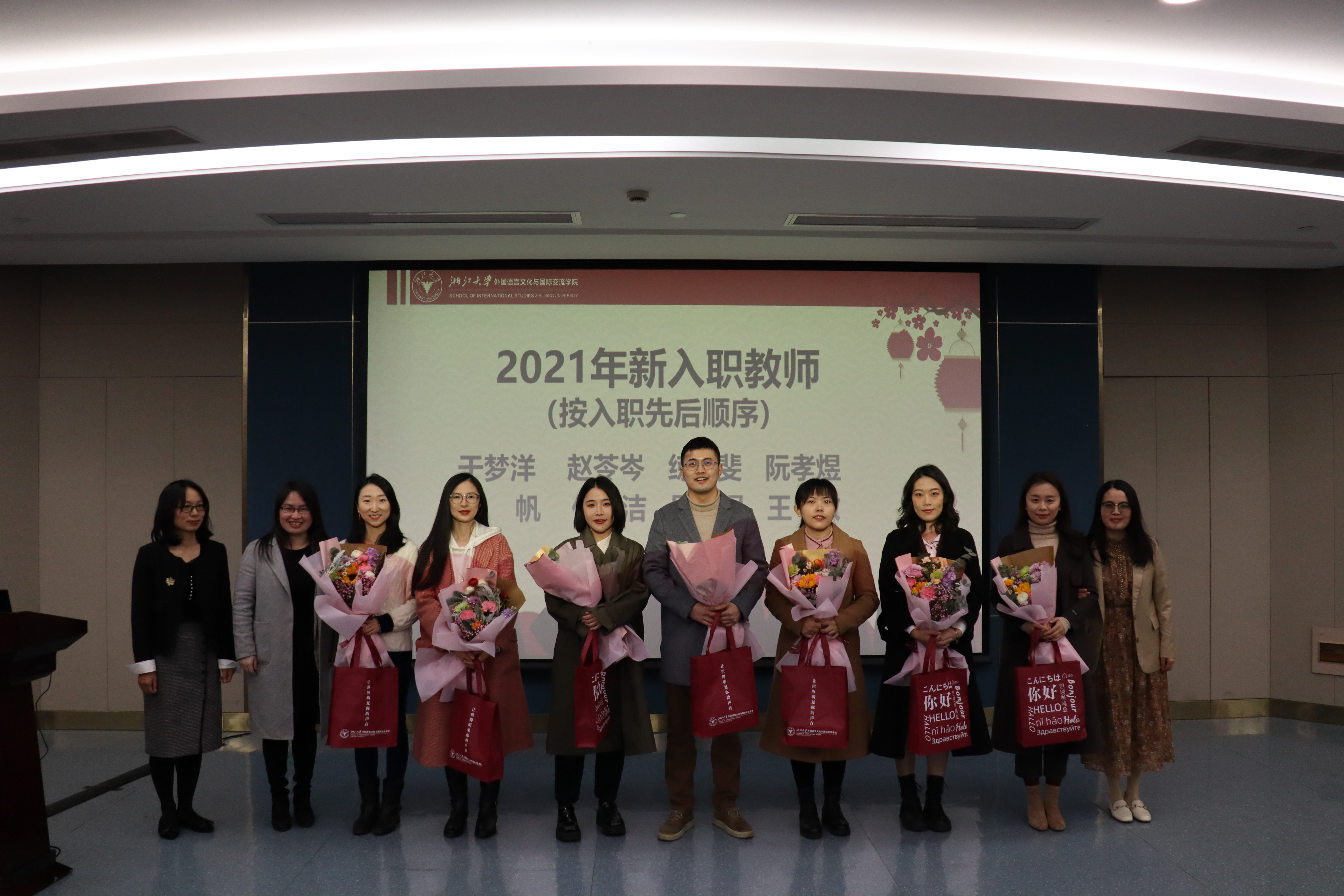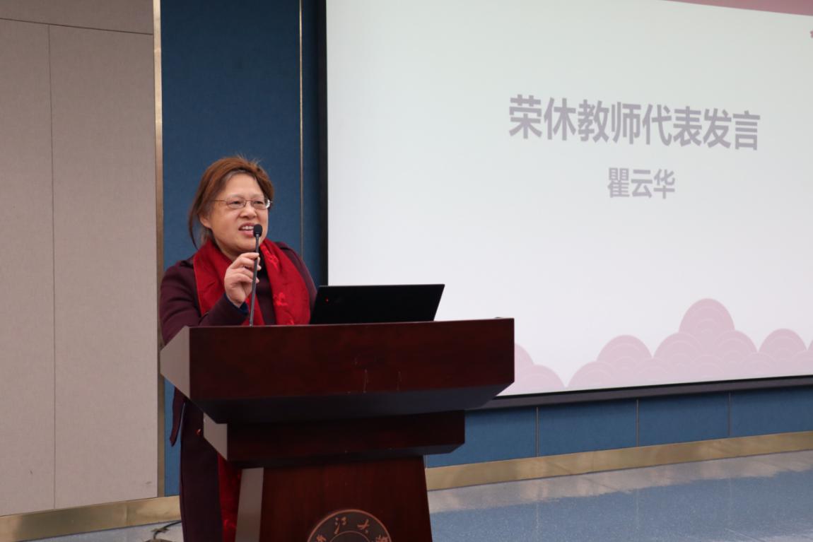 会上还举行了温馨而欢乐的“外院感谢您——2021年退休教职工荣休仪式”“外院欢迎您——2021年新教师入职仪式”“外院祝贺您——2021年度先进表彰仪式”。领导班子为荣休教职工、新入职教师送上鲜花和祝福,为院级先进工作者颁发荣誉证书。荣休教师代表瞿云华老师和新教工代表阮孝煜发言。