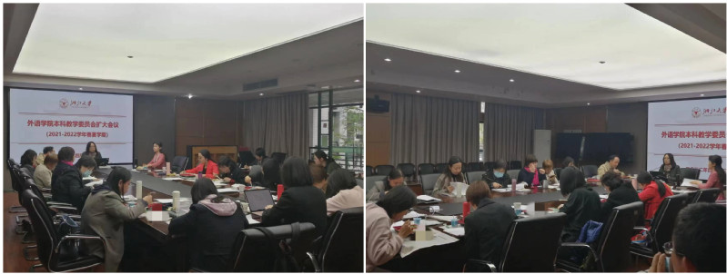 丹樱结春实,紫笋翻夏箨,2022年4月15日下午,外语学院2021-2022学年春夏学期本科教学委员会扩大会议暨外语学院课程思政工作坊专题会议在东5-201会议室举行。会议主要就2022级本科专业培养方案制定、课程设置与课程思政建设为主要议题。学院党政班子全体成员,各系主任、副系主任,各本科专业和基层教学组织负责人等20余人参会。会议由分管本科教学副院长赵佳主持。