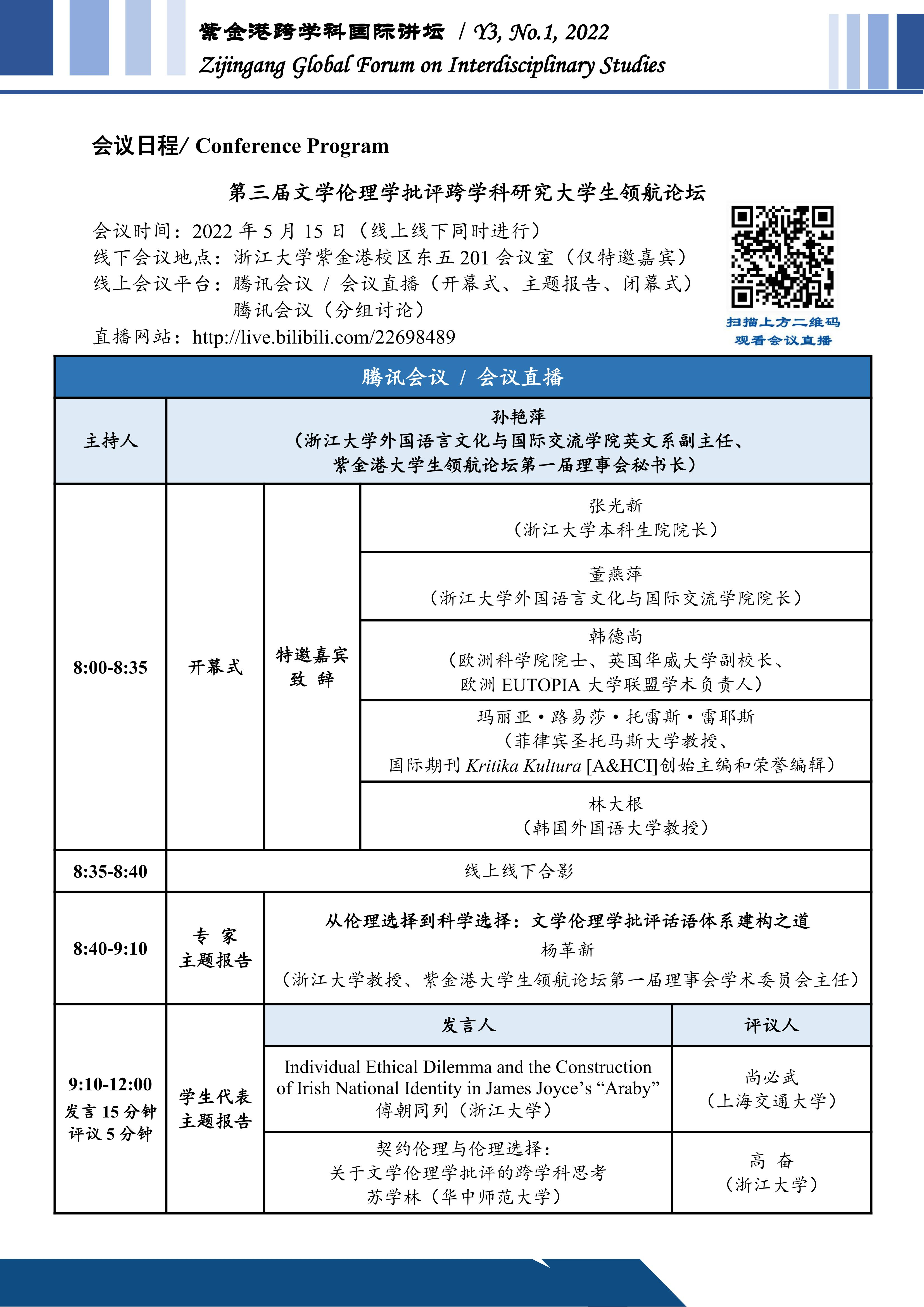 为了推动浙江大学一流本科课程建设及高质量教学研究,浙江大学世界文学跨学科研究中心、本科生院教务处通识教育中心、外国语言文化与国际交流学院英文系联合英国华威大学、韩国建国大学、韩国外国语大学和菲律宾圣托马斯大学于2022年5月15日共同举办“紫金港跨学科国际讲坛”系列活动七:“第三届文学伦理学批评跨学科研究大学生领航论坛”。