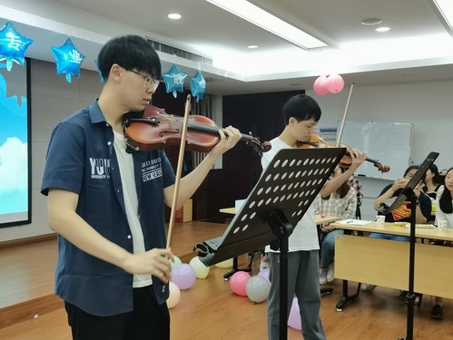 2021级德语专业本科生闰思琪演唱的歌曲《Ich kann alleine sein》安静舒缓,歌声中满载深情。随后,2018级德语专业本科生饶家丞与法语专业龙湖心共同带来的小提琴二重奏《巴赫双小提琴协奏曲》更是悠扬婉转,涤荡心灵,在场观众无一不沉浸其中,享受着雅乐带来的精神滋养。