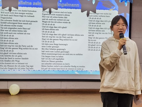 行至尾声,2018级本科生孙盛洲和2019级本科生聂若宜的德语诗歌朗诵成为了晚会的点睛之笔。一首《欢聚与离别》道出桃花潭水深千尺的情谊,一首《阶段》颂出扶摇直上九万里的新生。两位朗诵者以富有感情的语调赋予诗歌独特的魅力,为毕业生们送上最美好的祝福。