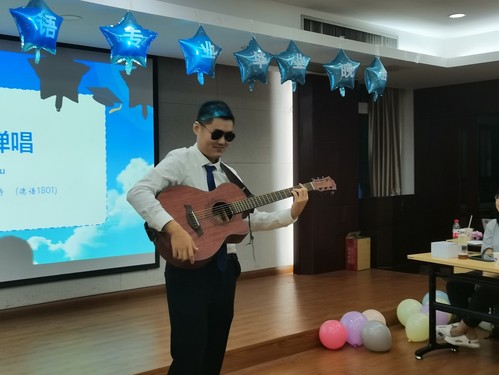 互动环节后,2020级的同学们为大家带来了两场生动活泼的德语配音。《神偷奶爸》和《千与千寻》中的片段搭配大家可爱多变的声音,让人忍俊不禁。2018级德语专业本科生徐惊涛更是以一曲节奏轻快的《Moskau》吉他弹唱将整场晚会推向高潮,同学们击节相和,歌声载满青春激昂,赋予了晚会一抹明快的色彩。
