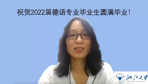 浙江大学外国语学院副院长赵佳教授通过视频为晚会致辞。她回顾了浙江大学德语学科的建设和发展史,盛赞德语学科建设成果喜人,并且为德语专业毕业生送上了衷心的祝愿。