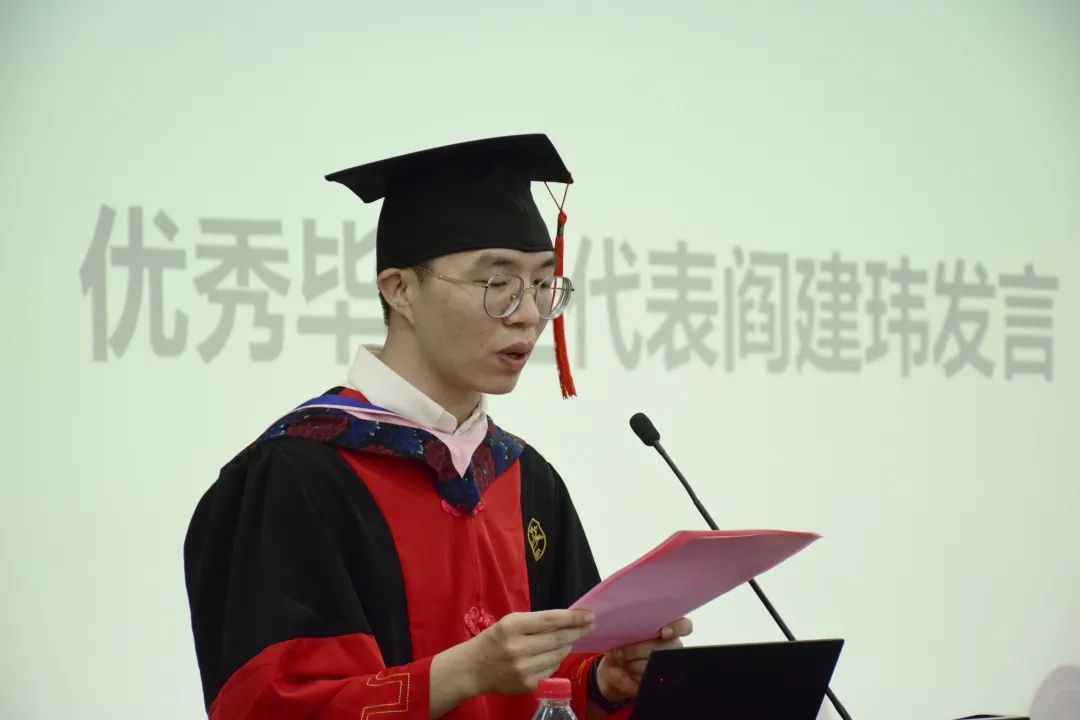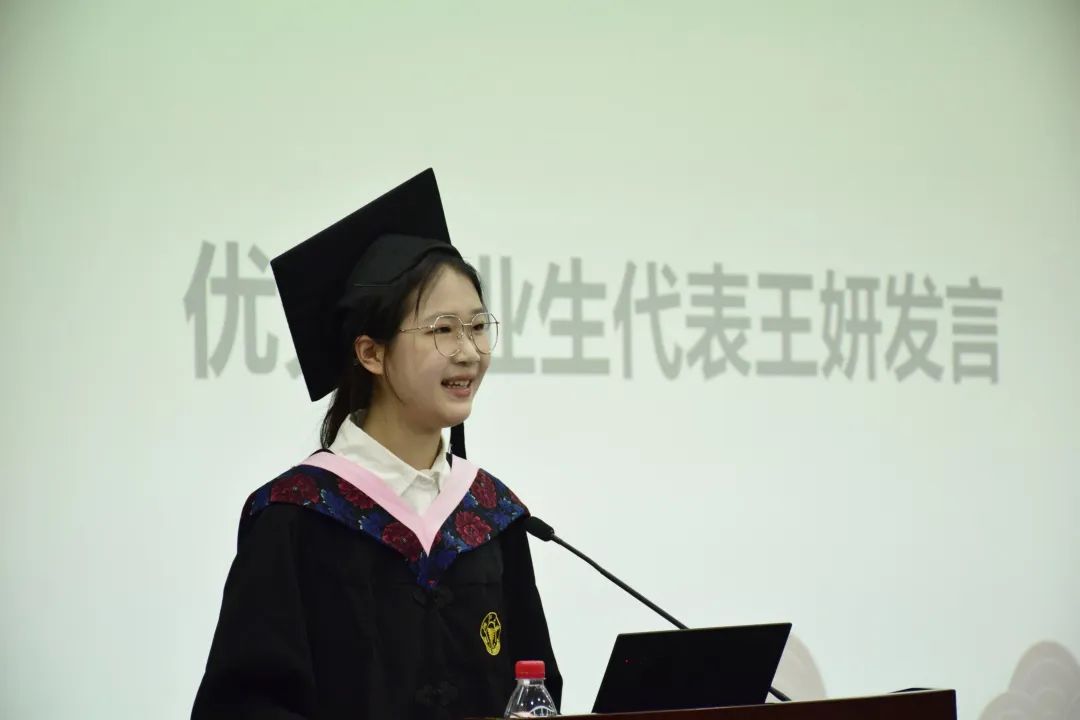 毕业生代表依次上台发言,表达了对学校、学院、老师的感激和不舍。优秀毕业本科生代表王妍回顾了过往的四年求学时光,学子们在学院的用心栽培下,在四课堂均衡发展的要求下,成长为兼具理性思辨和人文关怀、兼具家国担当与全球视野的外院人,她表示要带着四年的回忆和启迪在岗位上发光出彩,以此为不竭动力,为学校和学院增光添彩。优秀毕业研究生代表阎建玮回望了自己的科研之路,一次次的“促膝长谈”,一遍遍的 “字斟句酌”汇聚成了今日的“厚积薄发”。在外国语学院构建的坚实科研平台下,在导师的谆谆教导下,自己的科研能力逐年累月地提升。他表示,作为外语人,要心怀“国之大者”,秉承“求是创新”精神,扎根中国大地、不断开拓进取,用所学所知、所思所悟,为实现中华民族的伟大复兴献出一份力量;要拓展学术的外延,始终把个人梦想和中国梦有机结合起来,把家国情怀和世界目光结合起来,为全人类的福祉奋斗终身。