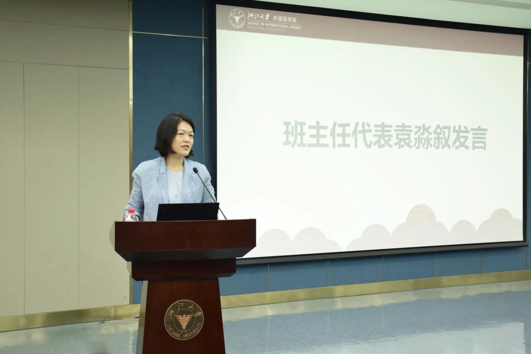 班主任代表、德育导师代表为同学们送上寄语,祝贺同学们顺利完成学业,迈入下一段人生旅程。班主任代表袁淼叙谈到,四年光阴对价值观形成、知识学养、综合能力的提升和友情的涵养都是一笔财富。她希望同学们时刻牢记浙大人、浙大外院人身份,为母校、母院发展添砖加瓦,并引用徐霞客的“大丈夫当朝碧海而暮苍梧”,鼓励同学们去探索和创造更广阔的世界。研究生德育导师闻人行围绕“I am a slow walker, but I never walk backwards”,鼓励同学们即便前路可能会更加陡峭崎岖,也不要停下脚步,要保持向目标迈进的坚定和执着。她还借自己求学之路的艰辛,勉励同学们只要向前迈进,就一定能超越自己,就一定不会度过平庸的一生。
