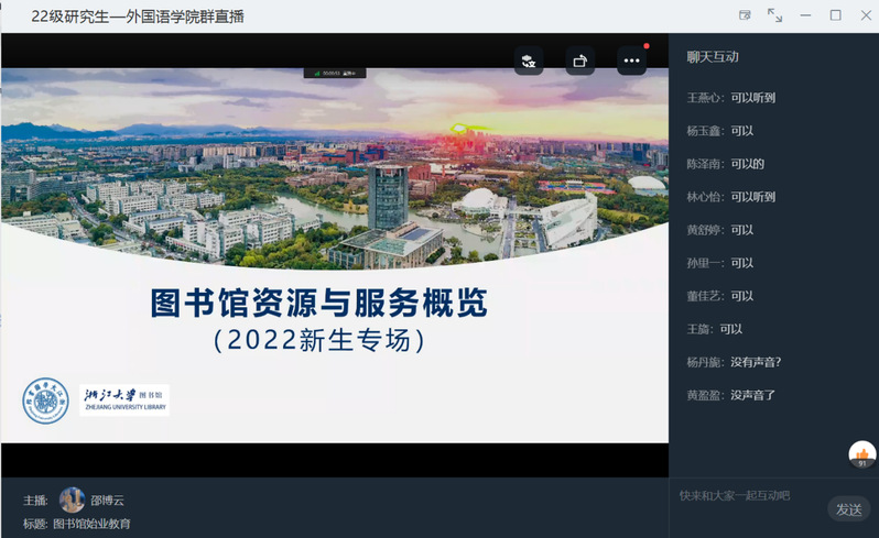 为提升研究生科研素能,为研究生新生上好开学第一课,9月14日晚7点,浙江大学图书馆馆员邵博云通过钉钉线上会议的形式,为研究生新生们展开了以图书馆资源与服务概览为主题的讲座。首先,邵博云分别介绍了各校区图书馆的基本情况,包括其藏书资源、特色服务和开放时间。接着,她详细说明了如何在图书馆借阅、荐购纸质资源,以及如何在校内外进行电子资料的检索。以Web of Science为例,邵博云为同学们解说了利用数据库检索、确认优质文献的方法。最后,邵博云又介绍了图书馆的资源、咨询和文化相关的各种服务,鼓励同学们积极。此次报告为同学们充分利用校图书馆的丰富资源提供了便利,相信在这些资源的帮助下,同学们的科研学习生活能够更加便捷、高效。