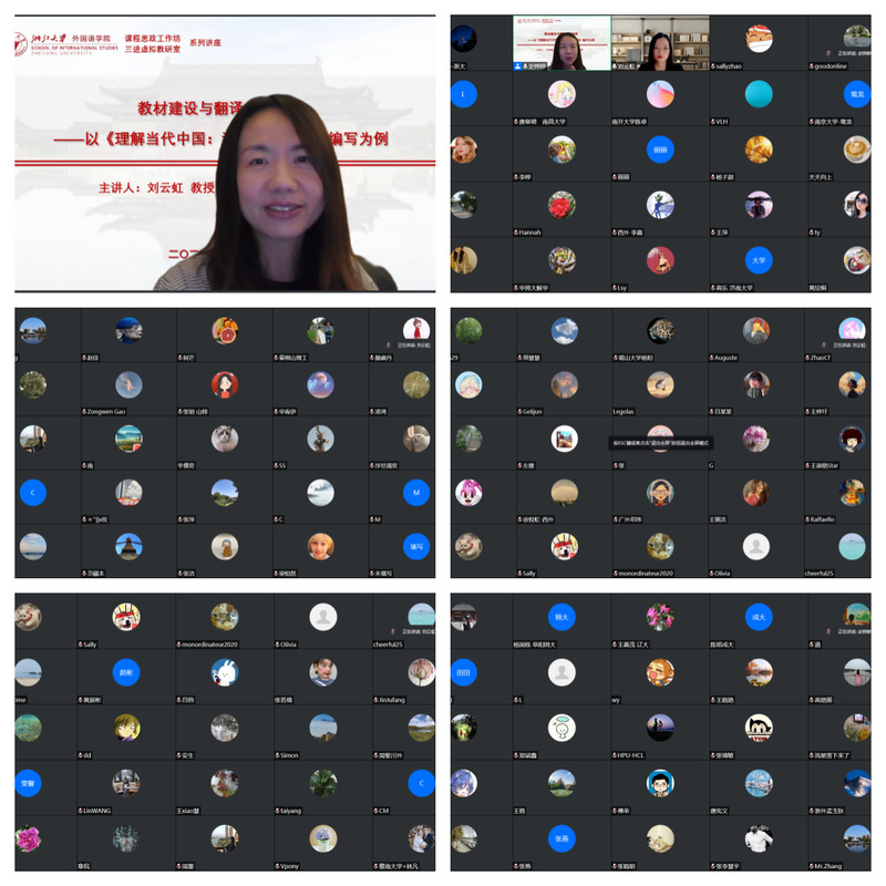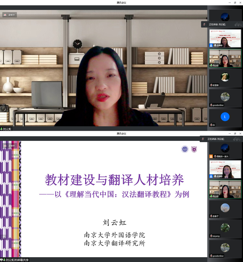 11月11日,南京大学教授、博士生导师刘云虹通过云端带来“教材建设与翻译人才培养——以《理解当代中国:汉法翻译教程》编写为例”专题辅导报告。本次报告会是浙江大学外国语学院课程思政工作坊和“三进”虚拟教研室系列讲座之一,吸引了我校和来自南京大学、广东外语外贸大学、对外经济贸易大学、暨南大学、西安外国语大学、杭州师范大学、浙江外国语学院等全国十几所高校的180余位教师参加。报告会由我院法语所史烨婷副教授主持。