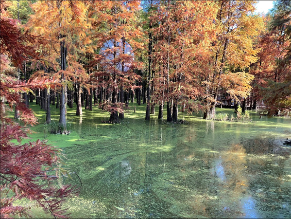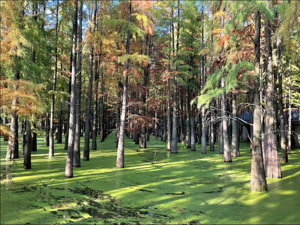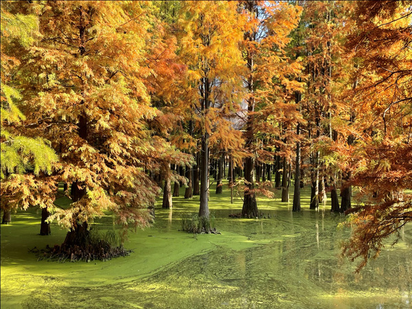 下午,老师们又来到了邻近的青山湖景区,游览水上森林公园。乍进公园,看见游人如织。及到迈入高大挺拔的水杉树林,才发现众多游客慕名而来,确实是不虚此行。重重叠叠的漫天黄叶与无边无际的满湖碧水交错掩映,仿佛浓墨重彩的油画,将人们席卷其中。走走停停,恍惚间,忘了今夕何夕。