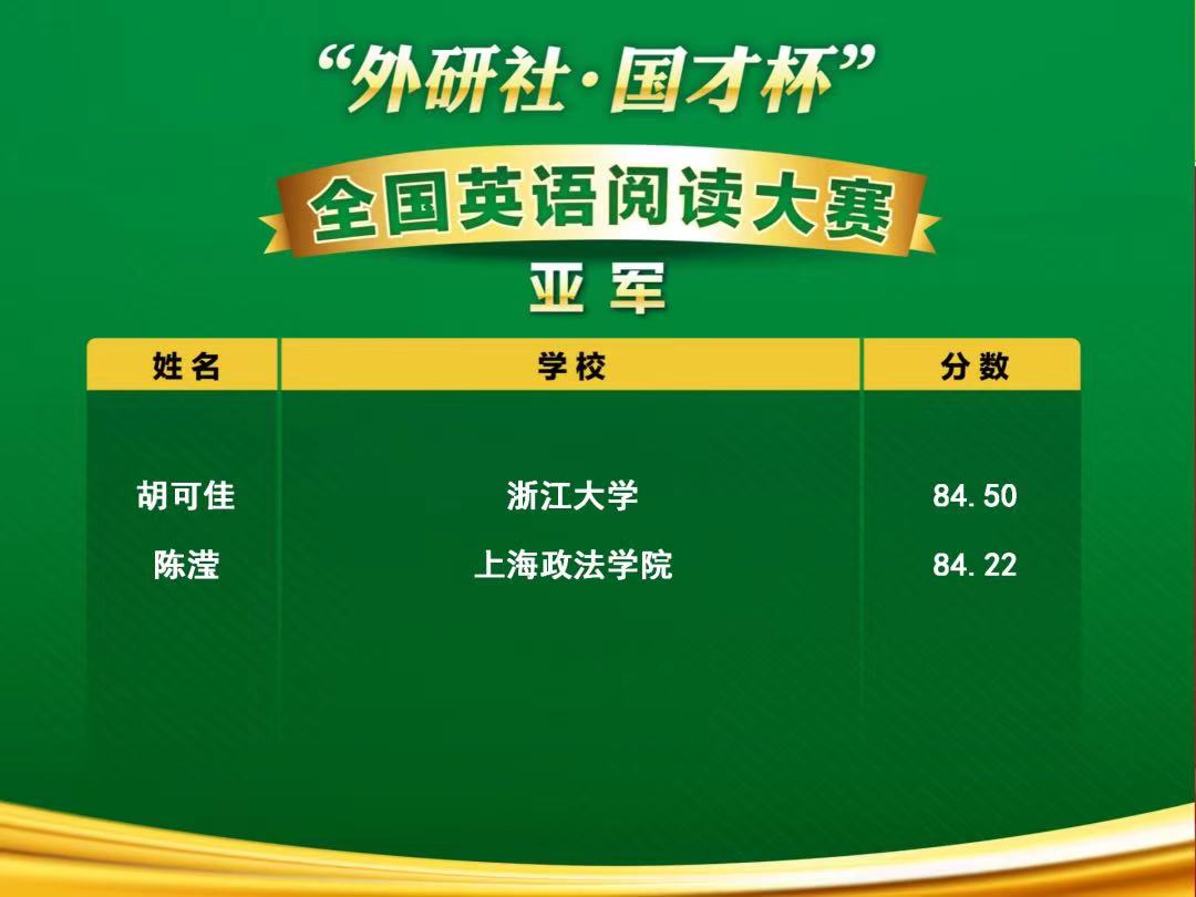在外国语学院方富民老师的指导下,来自药学院的胡可佳同学秀出班行,突破重围,以扎实的学术专业功底、深厚的人文哲学积淀、过硬的信息处理及表达能力荣获了特等奖亚军的佳绩。同时,来自外国语学院英语专业胡佳蕴同学也荣获了二等奖的优异成绩。浙江大学成为全国唯一一所在“外研社·国才杯”全国英语演讲、写作、阅读三大赛事中均有选手获得特等奖的高校。