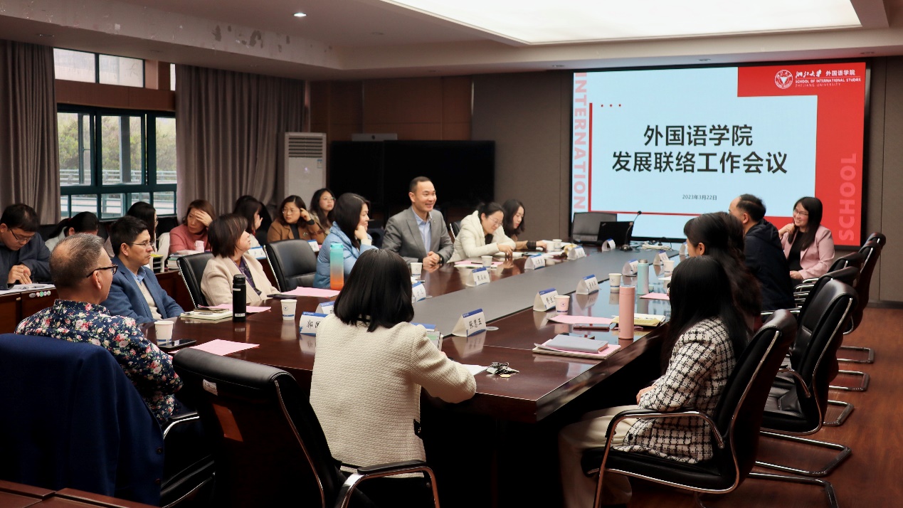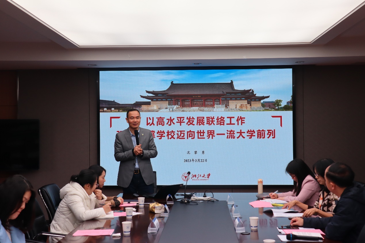 3月22日,浙江大学教育基金会领导专题报告暨外国语学院发展联络工作会议在东五201召开。校发展联络办公室主任、教育基金会秘书长沈黎勇,国内发展部部长倪倩,外国语学院院长董燕萍,党委书记罗泳江,党委副书记费兰兰,副院长赵佳、闵尚超、张慧玉,外国语学院发展联络工作小组全体成员和秘书参加会议。