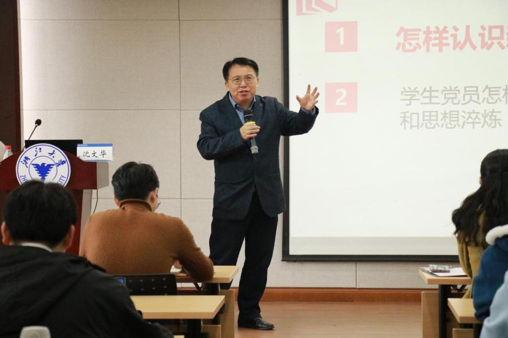 沈文华结合习近平总书记的重要讲话,结合大量的生动案例,围绕新时代党性修养这一主题向在座学生党员提出了三点要求:一是要做有远大理想和坚定信念的奋斗者,要做有理想、有抱负,信念坚定的新时代青年,积极主动地融入时代洪流中去;二是要做热爱学习、善于学习、勤于思考、勇于探究的实践者,学习党的创新理论,掌握正确的世界观、方法论,勤于思考,勇于探究;三是要做热爱生活、有合作精神、有美好情怀的社会中坚,让青春在奉献中焕发绚丽光彩。