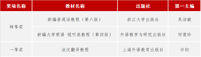 近日,浙江大学首届优秀教材奖名单揭晓,我院吴洁敏教授、何莲珍教授主编的教材《新编普通话教程(第六版)》《新编大学英语 视听说教程(第四版)》斩获特等奖,许钧教授主编的教材《法汉翻译教程》荣获一等奖。