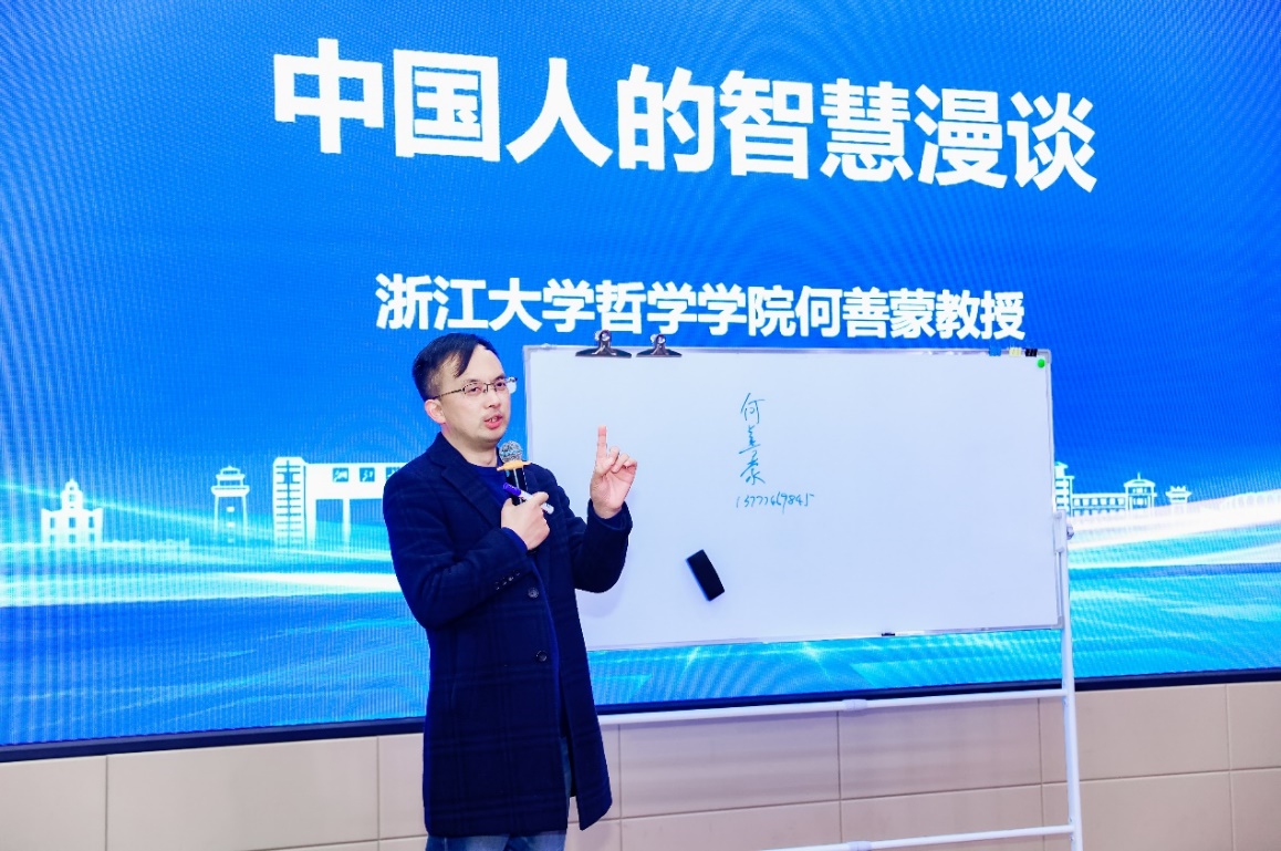 会议第一阶段为外国语学院校友新年论坛,由学院党委书记罗泳江主持。浙江大学哲学学院教授何善蒙为与会嘉宾带来主题为“中国人的智慧漫谈”的专题讲座。在讲座中,何善蒙教授独具匠心地提出通过“微笑而一言不发”的方式来表达中国的传统智慧。这一简约而深刻的表达方式不仅独具文化内涵,也向听众展示了中国智慧的独特魅力。接着,何教授以当今竞争激烈的内卷时代和中医中“阴阳失调”的例子介绍了独属中国人的智慧——平衡之道。通过巧妙的中西对照探讨了心、脑的关系,强调了心在中国传统文化中的核心地位。最后,何教授详细介绍了心学的三位关键人物:孟子、陆九渊和王阳明。专题讲座为与会嘉宾带来了一次穿越时空的心灵之旅,引领大家更深入地了解和体验中国心学的丰富内涵。