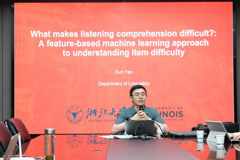2024年6月17日下午,美国伊利诺伊香槟分校(University of Illinois at Urbana-Champaign,UIUC)副教授闫逊应邀在东五201为外国语学院师生们带来了一场题为“What makes listening comprehension difficult?:A feature-based machine learning approach to understanding item difficulty”的精彩讲座。此次讲座由外国语学院闵尚超教授主持。