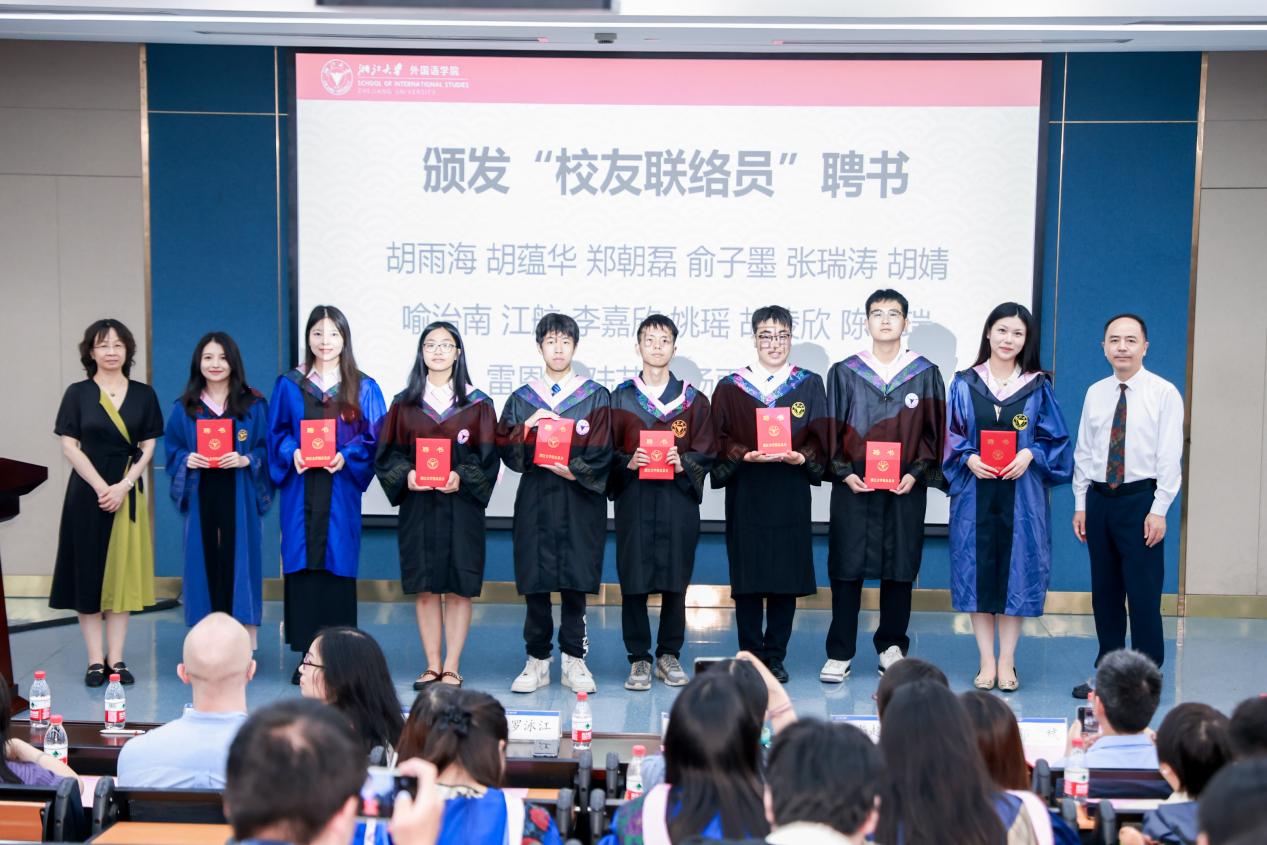 典礼上,党委书记罗泳江、院长董燕萍为荣获“浙江省优秀毕业生”,“浙江大学优秀毕业生”,“浙江大学外国语学院服务国家战略优秀毕业生”称号的毕业生代表颁发荣誉证书,并为被聘请为校友联络员的毕业生代表颁发聘书。副院长赵佳、闵尚超向毕业生代表赠送纪念品。今后无论身在何方,外院都将是学子们的温暖港湾和坚实后盾。