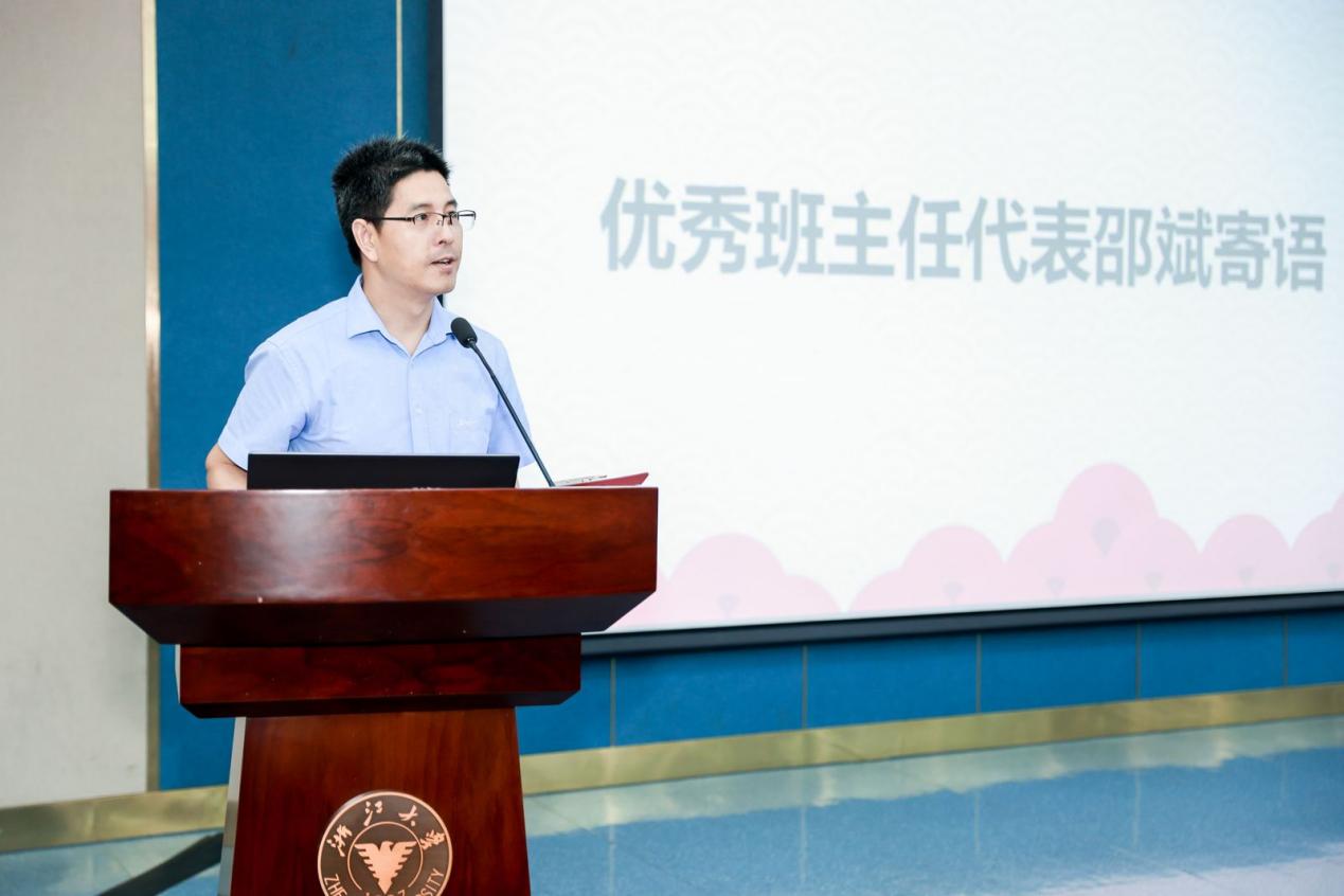 优秀班主任、德育导师代表为同学们送上寄语,祝贺同学们顺利完成学业,进入新的人生阶段。班主任代表邵斌期待同学们顺应时代发展,走“外语+”的个人发展道路;学会跨学科合作,发挥外语人才不可或缺的作用;摒弃狭隘思维,拓宽视野,真正做到“大不自多,海纳江河”。德育导师代表滕琳围绕自身经历,鼓励同学们坚定心之所向,向光而行、向阳而生,提升核心竞争力。同时,她勉励同学们要学会感受幸福、感恩生活中的一切遇见,在放射自己光芒的同时,也点亮他人的灯。