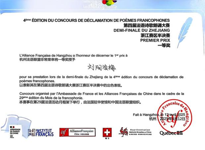 2025年4月12日, 第四届法语诗歌朗诵比赛全国半决赛(浙江赛区)在浙江工商大学杭州法语联盟多媒体图书馆举行。本次比赛为29届法语活动月活动之一,由中国法语联盟联合法国文化中心、瑞士驻华大使馆、魁北克驻华代表处及比利时瓦隆-布鲁塞尔国际关系署共同主办,旨在以诗歌为媒介,搭建中外文化交流的桥梁,激发法语爱好者的创造力与表现力。