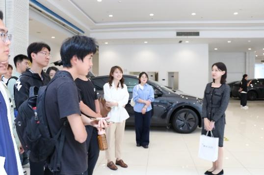 活动伊始,参访师生在一楼展厅近距离观摩了特斯拉Model 3与Model Y两款车型。特斯拉浙江对外事务经理刘懿详细介绍了车辆的核心技术特点,包括高效能低耗的动力系统、独特的外观设计以及一体成型的高效生产工艺。随后,师生们参观了交付大厅和售后服务区,了解了特斯拉为客户提供的销售、交付与售后一体化服务模式及其高效便捷的特点。