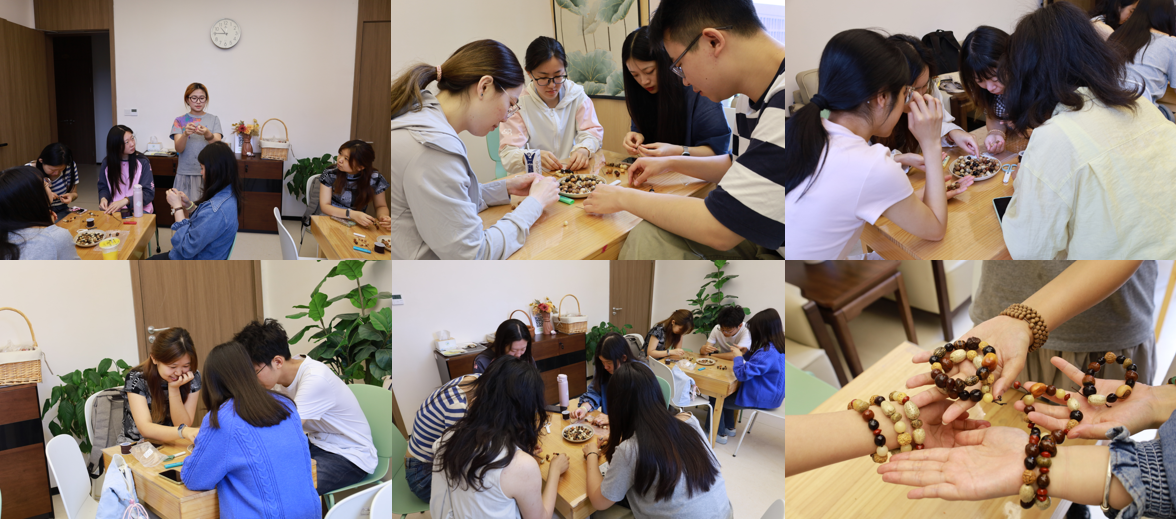 当天正值5月25日全国大中学生心理健康日,徐佳乐介绍了这个日子的由来,通过心理健康知识分享的形式,引导支部成员关爱自我、悦纳自我、提升自我,进而关注身边同学的心理健康,共同创造更加包容美好的社会。党员们走进浙江大学心理健康教育与咨询中心进行“珠语心连”手串DIY心理美学体验活动。同志们伴随着音乐静心冥想,感受不同菩提籽的特殊气味与纹路,随后在志愿者的带领下逐步制作手串。同志们在此过程中放松自己、减轻压力、感受宁静,更在互动协作中增进了情感联结与团队凝聚力。