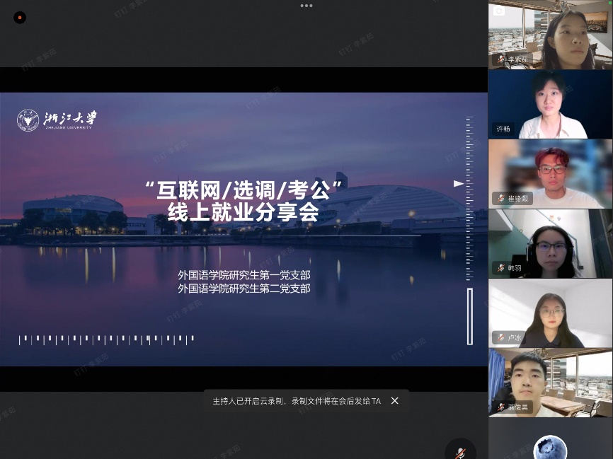 2025年6月20日,浙江大学外国语学院研究生第一党支部与研究生第二党支部联合举办的“互联网/选调/考公”线上就业分享会顺利开展。本次分享会特别邀请四位2025届英语语言文学专业硕士毕业生进行分享,包括即将就职于华为技术有限公司的崔骆灏、杭州游卡网络技术有限公司的韩羽、赤峰市红庙子政府的卢冰和全国对外友协的应真伊。四位优秀的学长学姐分别从互联网行业、游戏行业、选调考试以及国考等不同领域为同学们倾囊相授就业经验,助力同学们在职业规划与求职道路上稳步前行。