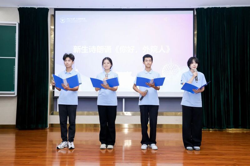 新生代表以一首《你好,外院人》双语朗诵,展现了外院学子卓越的语言功底与开阔的文化视野。同学们精神昂扬、声情并茂,通过流畅的语际转换与富有感染力的声调处理,体现出扎实的专业功底和融通中西的文化自信。节目内容立足学院传统、呼应时代主题、融合中西文化元素,抒发了新一代外语人强烈的归属感和面向未来的坚定信念,现场气氛温馨热烈。