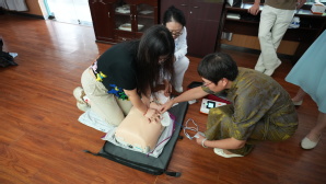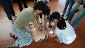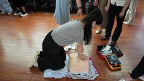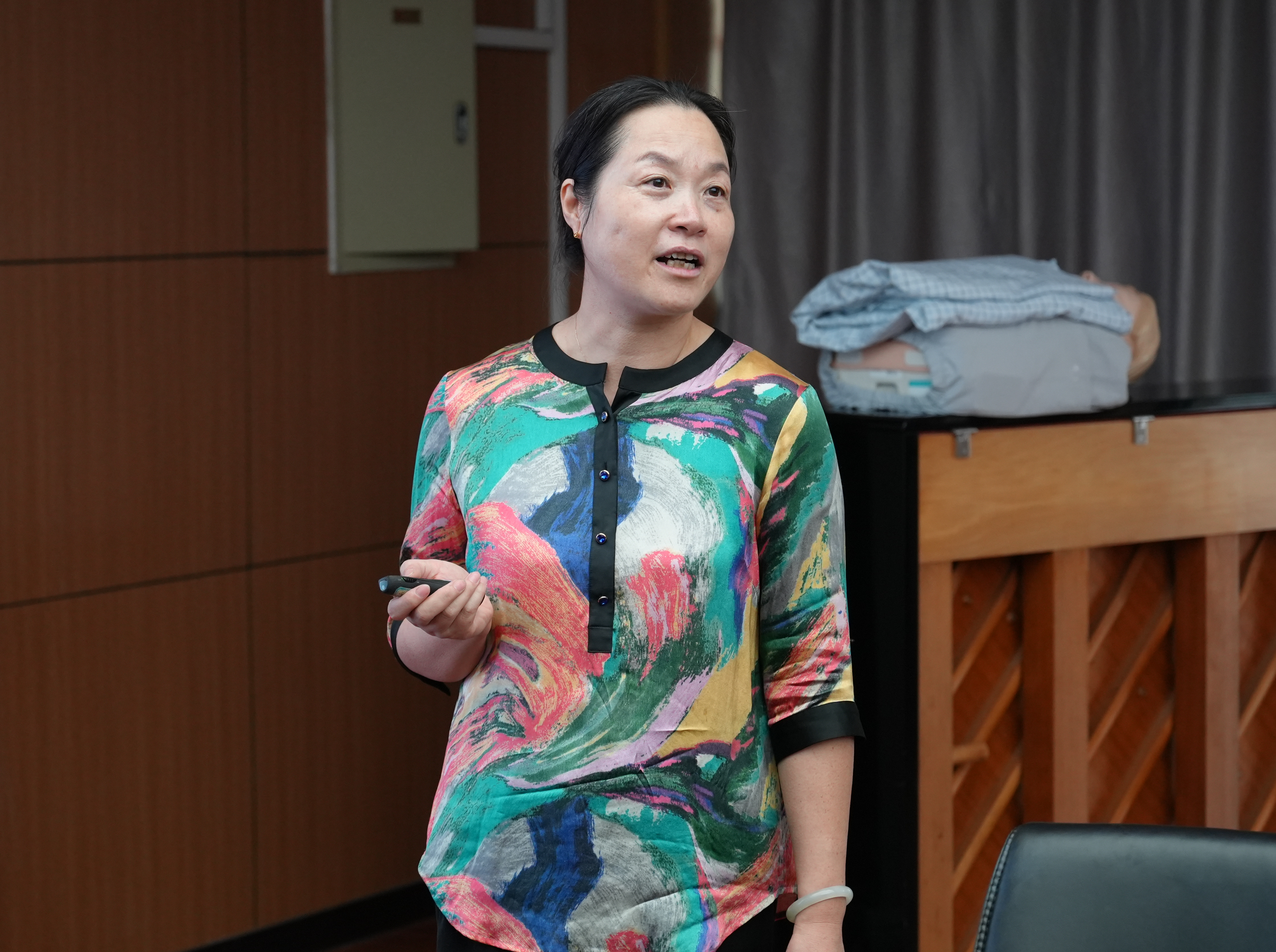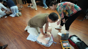 “双手交叉按在胸骨中下段,按压深度5-6厘米,频率保持每分钟100-120次……”在实操训练环节,师生分组使用模拟人进行CPR练习,方浩主任及校医院的刘莉护士长逐一调整纠正大家的按压姿势、呼吸频率等细节。针对AED使用,师生轮流体验模拟设备的开机、电极片粘贴、除颤操作全流程,掌握“开机即听语音提示”的关键口诀。