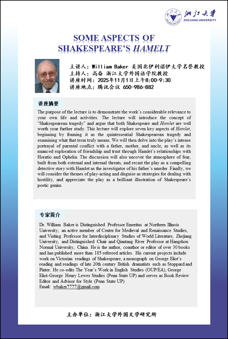 Dr. William Baker is Distinguished Professor Emeritus at Northern Illinois University, an active member of Center for Medieval and Renaissance Studies, and Visiting Professor for Interdisciplinary Studies of World Literature, Zhejiang University, and Distinguished Chair and Qiantang River Professor at Hangzhou Normal University, China. He is the author, coauthor or editor of over 30 books and has published more than 185 refereed articles. His current projects include work on Victorian readings of Shakespeare, a monograph on George Eliot’s reading and readings of late 20th century British dramatists such as Stoppard and Pinter. He co-edits The Year’s Work in English Studies (OUP/EA), George Eliot-George Henry Lewes Studies (Penn State UP) and serves as Book Review Editor and Advisor for Style (Penn State UP).