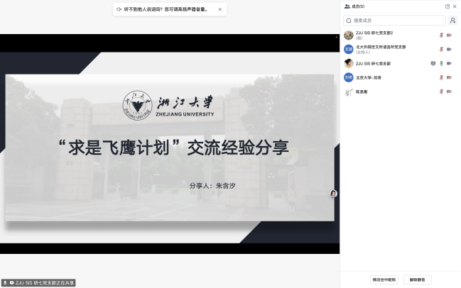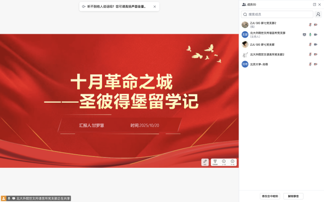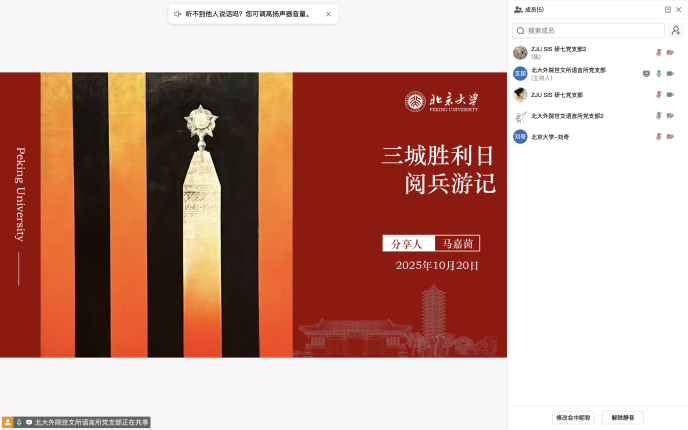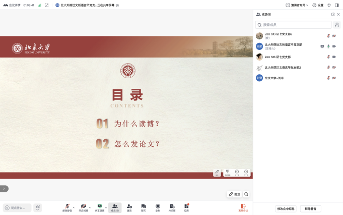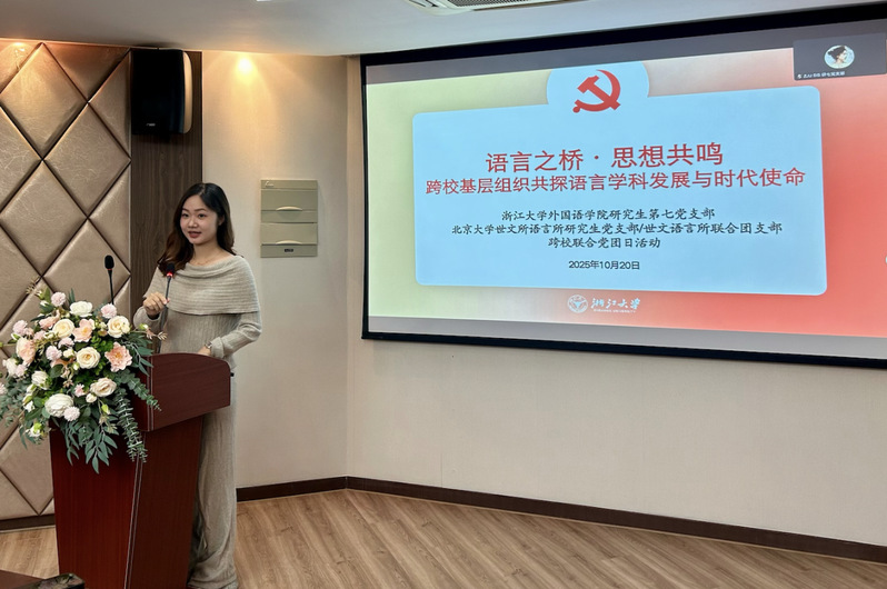 为充分发挥朋辈引领作用,引导青年学生党员将学业发展与国家需求紧密结合,以实际行动践行“强国有我”的青春誓言,2025年10月20日,浙江大学外国语学院研究生第七党支部联合北京大学外国语学院世文所语言所党团支部、本科生第五党支部开展“讲好中国故事:全球视野与青年担当”主题党日活动。活动采用“线下主会场+线上云连线”模式,两校分别在各自校区设置线下会场,通过网络会议平台实现实时互动交流。浙江大学会场由外国语学院研究生第七党支部书记方可昕主持。