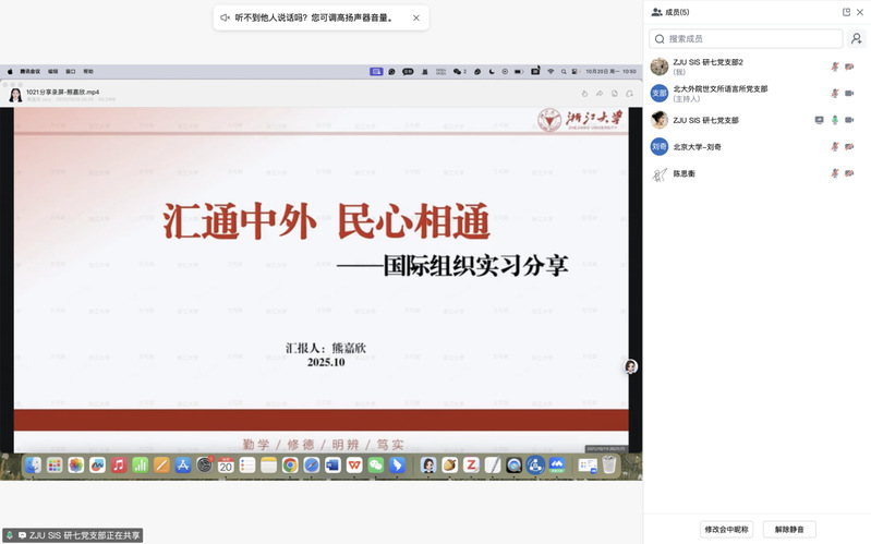 首先,浙江大学外国语学院2023级翻译学硕士研究生熊嘉欣结合其在中国国际知识发展中心、上海合作组织的实习经历,系统介绍了国际组织的职能定位、业务范围与工作流程。她以“汇通中外、服务大局”为核心,详细拆解了国际组织工作所需的语言能力、跨文化沟通技巧及政策理解水平,并通过具体工作案例,展现了中国青年在全球治理舞台上的专业素养与责任担当,为有志于投身国际组织工作的同学提供了清晰的职业规划方向与实践路径。