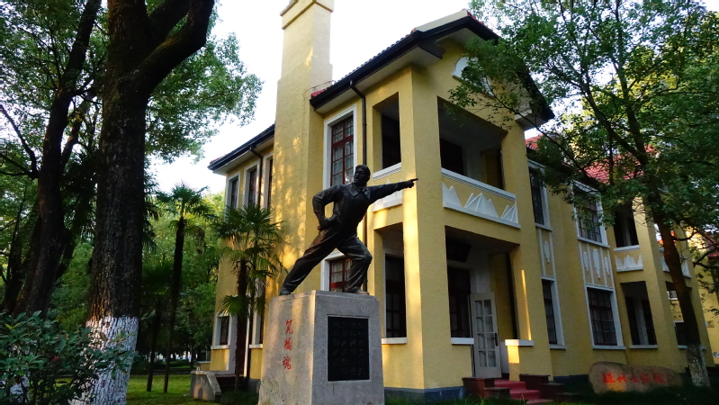 当日午后,参访队伍怀着崇敬之心抵达笕桥,刻有“醒村”二字的石碑率先映入眼帘。“醒村”,取“中华民族觉醒”之义,是中央航空学校历史建筑群,环境优美,完整地保留了上世纪三十年代黄墙绿树的特征格局。飞行员雕塑在秋阳下熠熠生辉,石碑上镌刻了中央航空学校的校训——“我们的身体、飞机和炸弹,当与敌人兵舰阵地同归于尽!”,无声诉说着抗战期间我国空军战士以寡敌众、血洒长空的壮烈往事。这面镌刻着历史誓言的石碑,让在场师生的思绪瞬间穿越回硝烟弥漫的抗战岁月,真切触摸到空军英烈“以命护天”的抗争力量。