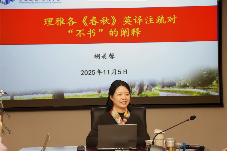2025年11月5日下午,浙江师范大学外国语学院胡美馨教授应邀莅临浙江大学中华译学馆,为外院师生带来了一场题为“理雅各《春秋》英译注疏对‘不书’的阐释”的学术讲座。讲座由郭国良教授主持,现场多位老师同学积极参与。