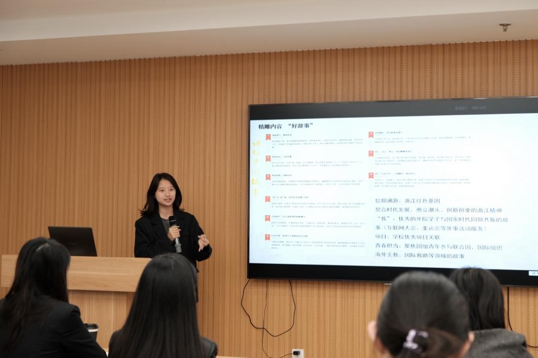 备课会还邀请到了第一任宣讲团团长林梓祺学姐。她再现了作为辅导员与硕士生身份曾参加比赛的两场高质量精彩宣讲:《求是园里的橘香》《“译”心向党》,为宣讲团展示了两种叙事切入口——以浙大身边人身边事的亲历视角与译者不同时期家国情况的历史视角,为同学开拓了新的宣讲思路与视角。在宣讲案例的基础上,林学姐生动直观地向大家拆解了外语学子讲好中国故事的三重密码,即“精准定位受众,架起双向对话的桥梁”;“选好故事内核,让中国叙事有温度、有深度”;“用故事替代说教”。