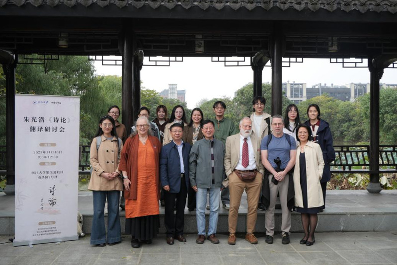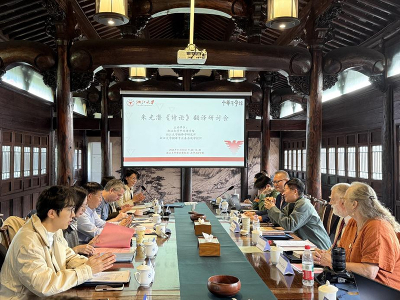 2025年11月10日上午,国家社科基金中华学术外译重点项目“朱光潜《诗论》翻译研讨会”在浙江大学紫金港校区南华园2号楼顺利举行。本次会议对《诗论》英译项目的进展进行中期汇报与翻译研讨。杭州师范大学资深教授殷企平、浙江大学中华译学馆常务副馆长郭国良、美国作家和诗人Ann Arbor以及浙江大学中华译学馆研究员杜磊受邀出席。项目组成员,包括美国贝洛伊特学院John Rosenwald,浙江大学Timothy John Osborne、池昌海、周闽、卢燕飞,以及项目负责人卢巧丹等团队成员共同参与研讨。会议由卢燕飞主持。