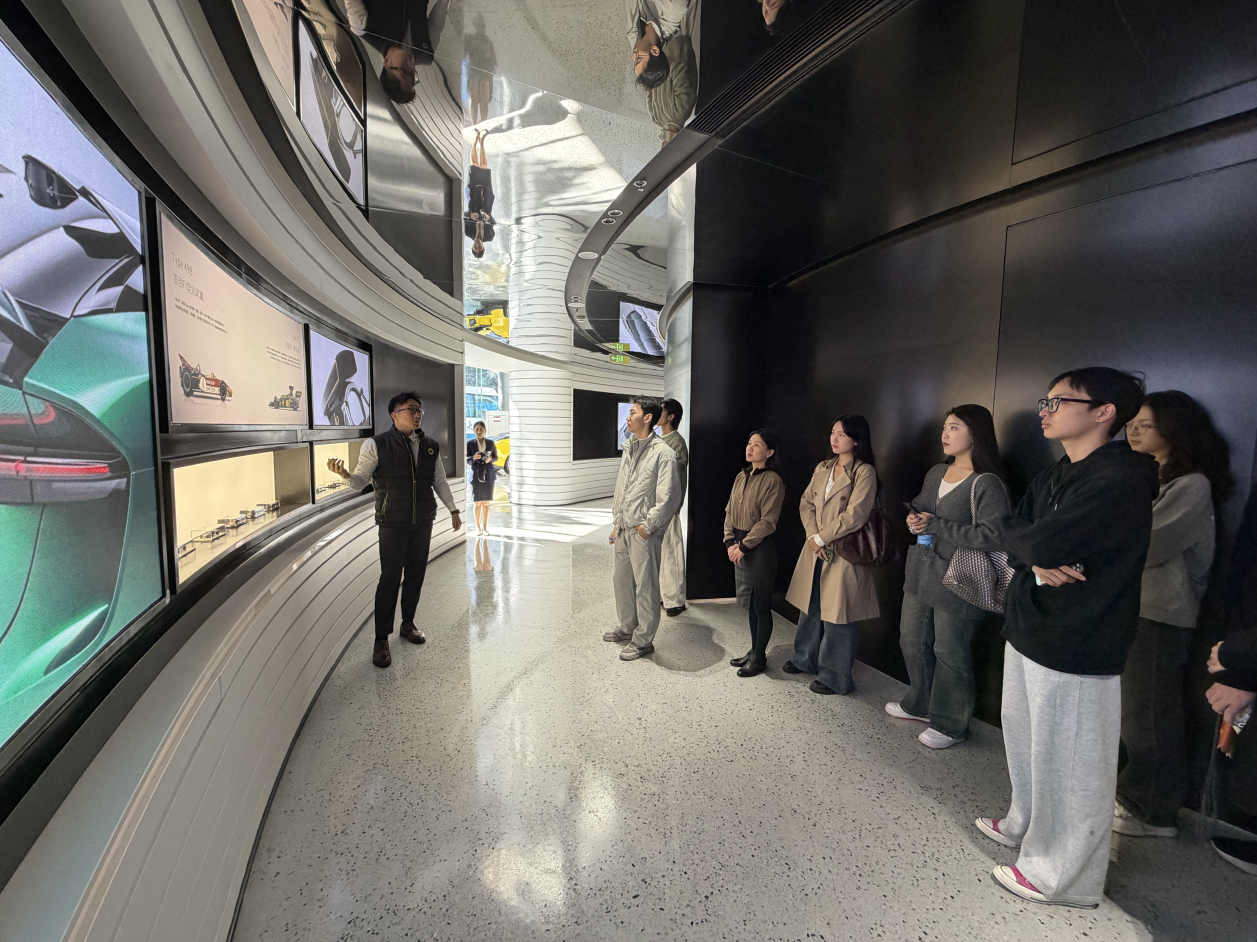 在工作人员的引导下,师生们首先参观了莲花汽车展厅,详细了解了企业的发展历程、品牌理念及技术创新成果。讲解员从企业创立背景、品牌故事到技术研发突破,系统介绍了莲花汽车的成长之路,让同学们对品牌的发展与国际化战略有了更加直观的认识。随后,师生们现场感受了个性化定制的设计理念与工艺流程,通过近距离观看车辆设计展示,深刻体会到科技创新与艺术美学在现代制造业中的融合。