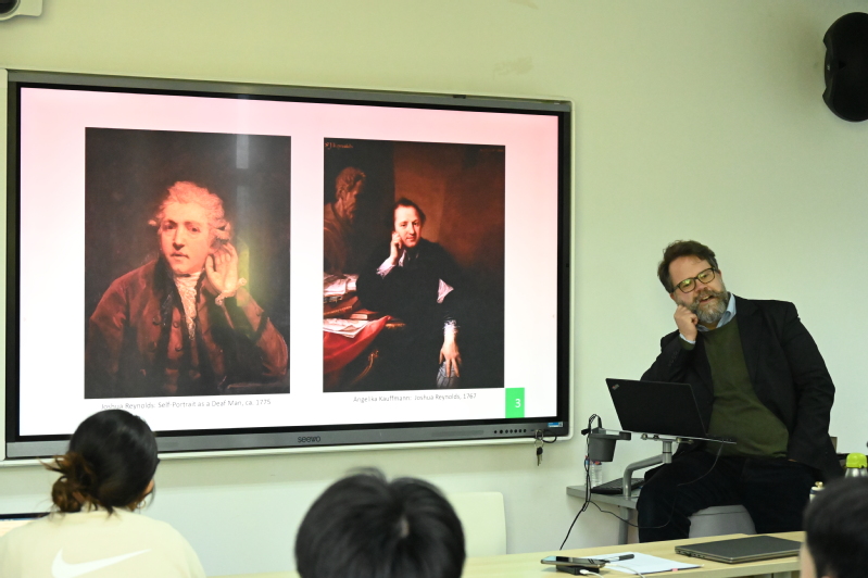 讲座开篇,Schmitt-Maaß教授展示了艺术史中关于“听觉障碍”的多种表现形式,并探讨了这一主题如何深刻影响艺术创作。他提到,在绘画艺术中,“手贴耳边”这一动作常用以象征听觉障碍;贝多芬的听障影响了他创作《第九交响曲》时的工作方式;从古代到现代,西方文化中一直存在与花瓶、座椅、扇子等器具相结合的各式助听器具,等等。