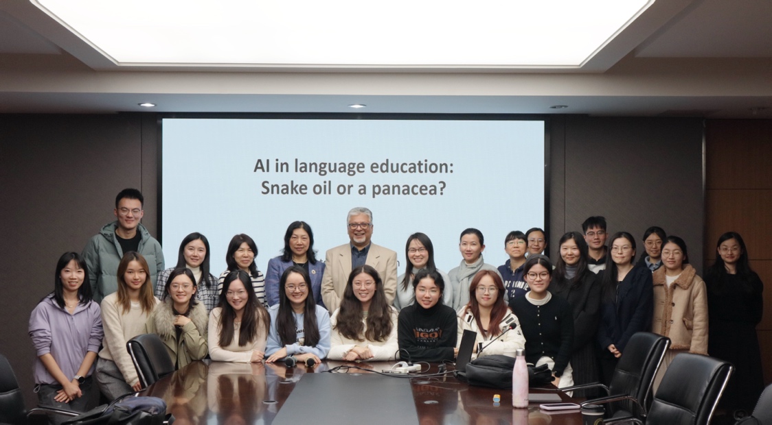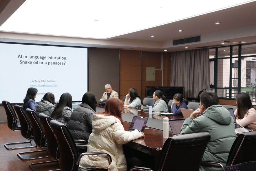2025年12月1日下午,国际知名语言测试专家Antony John Kunnan教授应邀为浙江大学外国语学院师生作题为“AI in language teaching, learning, and assessment: Snake oil or panacea?”的学术讲座。讲座由何莲珍教授主持,学院相关专业师生积极参与。