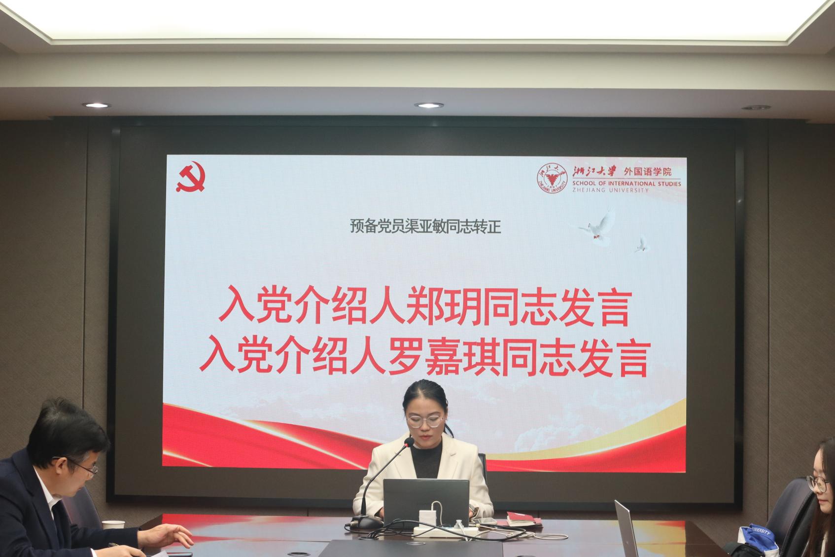 随后,入党介绍人郑玥同志和罗嘉琪同志介绍渠亚敏同志在预备期的相关情况。纪检委员周欣安同志代表支委会宣读群众意见,一致认为她积极向上,认真负责,具备转正条件。与会党员韩嘉露同志充分发表意见,认为渠亚敏同志具备转正条件,经与会正式党员投票表决,渠亚敏同志顺利转正。