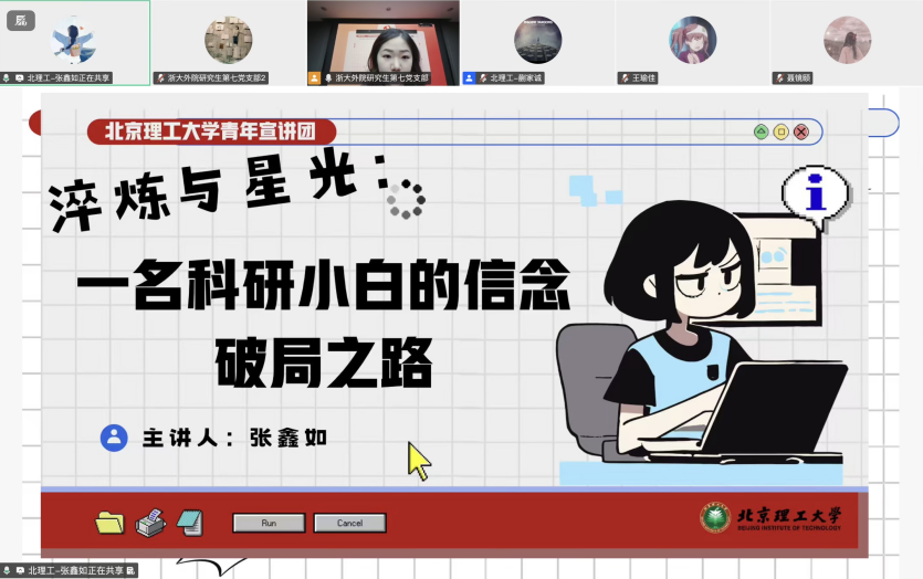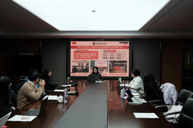 活动伊始,方可昕介绍了活动背景、目的和流程,并欢迎两校党员共同参与跨校联学交流。随后,两校支部书记分别作支部情况介绍。方可昕从支部组织结构、三会一课开展情况及“译路译学”党建品牌等方面展示了浙大外国语学院研究生第七党支部以外语特色服务国家战略的务实举措。北京理工大学自动化学院24级控制理论与控制工程硕士党支部书记蒯家诚则介绍了支部的学科方向与党建特色,涵盖人工智能、控制工程、优化理论等科研领域,体现了自动化学科在科技自立自强中的使命担当。