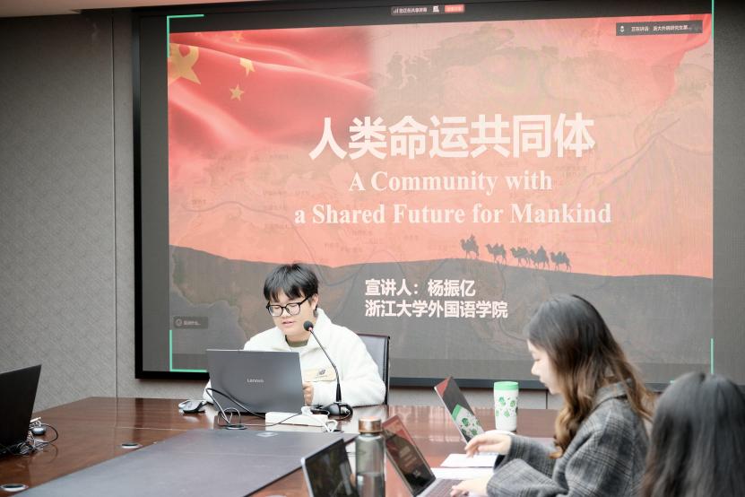 随后,浙江大学外国语学院研究生第七党支部副书记、“讲好中国故事”宣讲团成员杨振亿分享“人类命运共同体”主题党课,探讨外语学子融入“十五五”发展大局的实践路径。他结合外语学科优势与国际传播实践,重点介绍了新时代青年在促进全球交流互鉴中的使命责任及浙江大学在推动全球治理方面的坚实行动,生动诠释了外语学科如何助力文明交流互鉴与全球公共卫生治理。