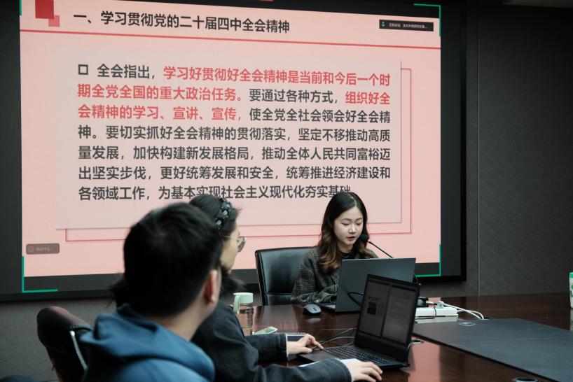 在主题学习环节中,两校党员围绕“我为‘十五五’建言献策”进行了深入交流学习。方可昕以“学习贯彻党的二十届四中全会精神,共绘‘十五五’宏伟蓝图”为题讲授党课,详细解读了全会关于制定“十五五”规划《建议》的重大意义,指出“十五五”时期是夯实基础、全面发力的关键时期。她介绍了学校及学院的“十五五”战略布局与发展规划,重点阐述了浙江大学中华译学馆在学院学科建设及平台聚合中的重要地位,鼓励支部党员通过投身支部“译路译学”党建品牌建设为中华译学馆相关活动的开展贡献力量。