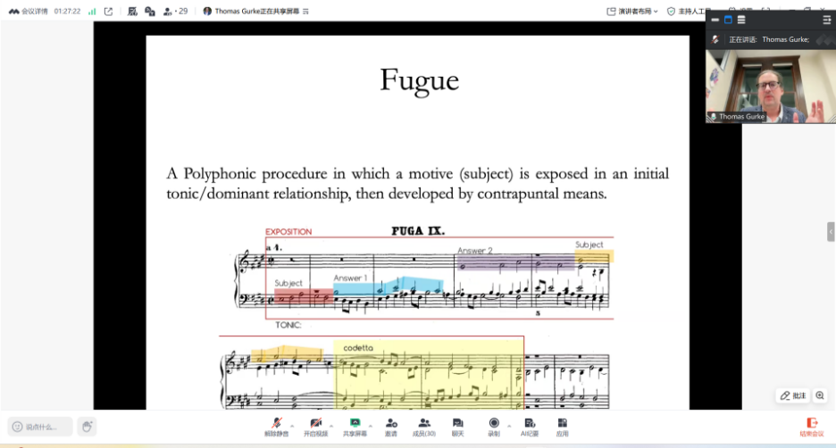 紧接着,Gurke教授就“塞壬”一章展开了精彩的文本分析。乔伊斯曾在信中明确将“塞壬”一章与赋格的复调音乐形式作比,Gurke教授解释道:乔伊斯并非单纯复制音乐形式,而是通过文学语言实现赋格复调的美学效果。章节中那些看似支离破碎、语义晦涩的短语(例如“Bronze by Gold”),在功能上类似于音乐的主导动机:它们在叙事中不断复现、变奏与发展;在句法音韵层面,文本则通过密集的头韵、谐音、词汇重复与句式转换,制造出类似旋律转调、对位交织的听觉效果,强调语言的声音质感。
