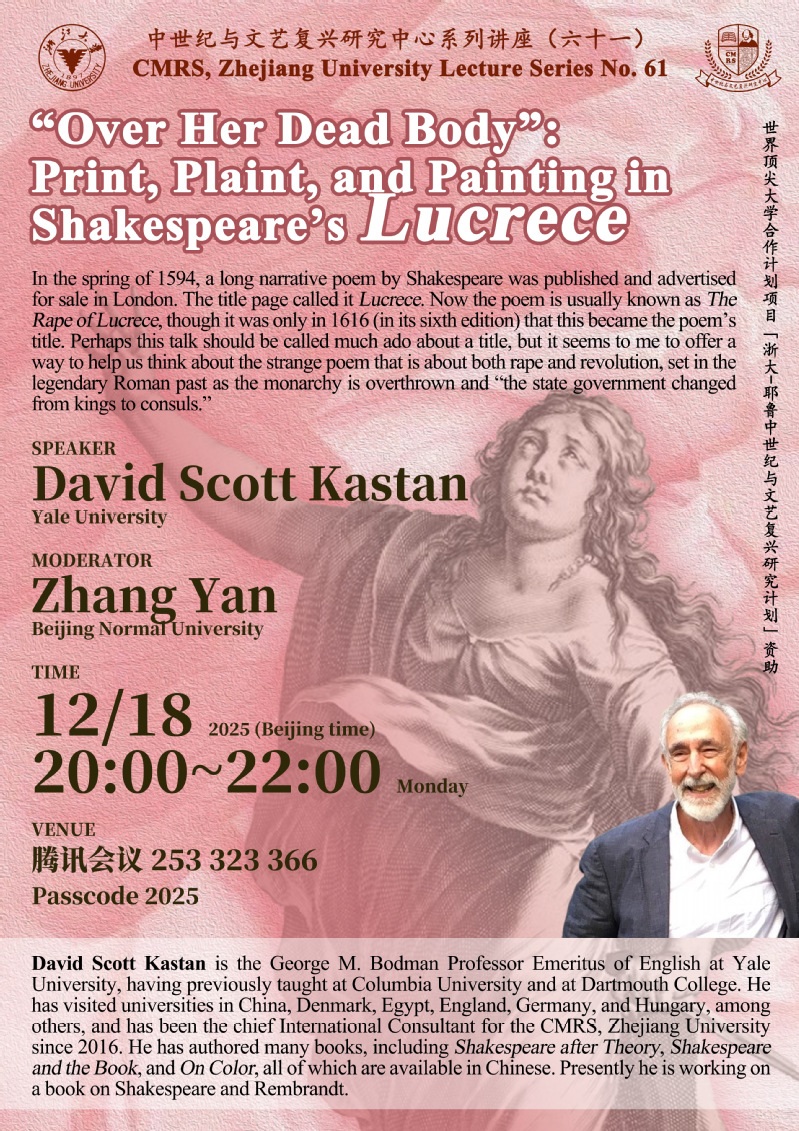David Scott Kastan is the George M. Bodman Professor Emeritus of English at Yale University, having previously taught at Columbia University and at Dartmouth College. He has visited universities in China, Denmark, Egypt, England, Germany, and Hungary, among others, and has been the chief International Consultant for the CMRS, Zhejiang University since 2016. He has authored many books, including Shakespeare after Theory, Shakespeare and the Book, and On Color, all of which are available in Chinese. Presently he is working on a book on Shakespeare and Rembrandt.