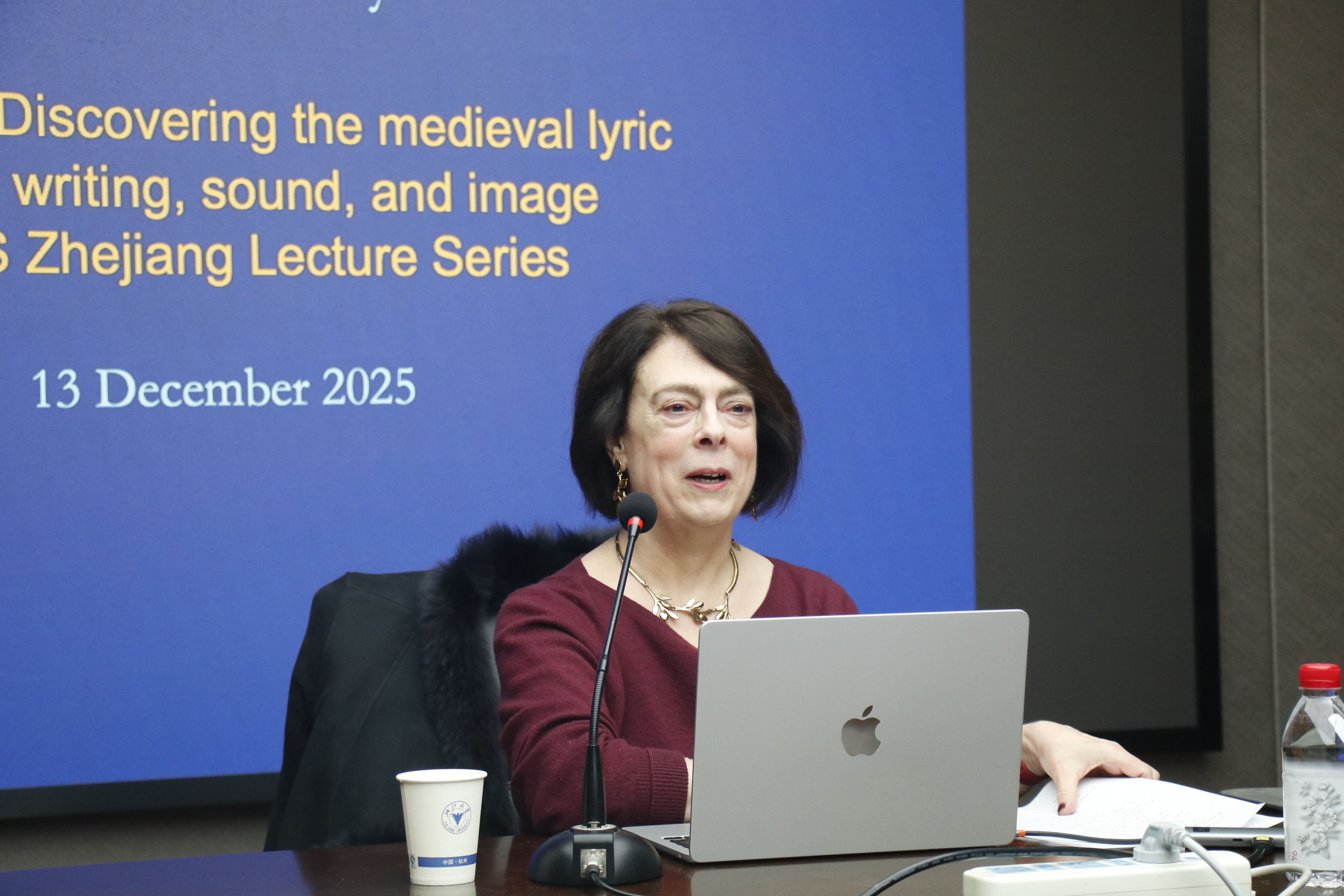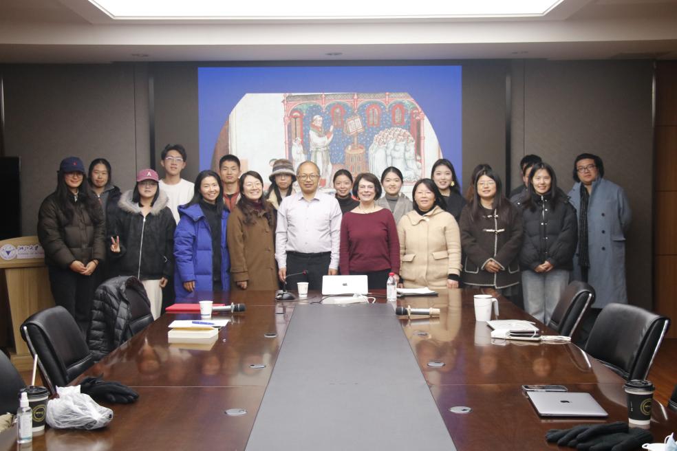 2025年12月13日,耶鲁大学阿迪斯·巴特菲尔德(Ardis Butterfield)教授讲座“歌曲:从写作、声音和图像中发现中世纪不列颠抒情诗”在浙江大学紫金港校区东五201顺利举行。本次讲座为浙江大学外国语学院中世纪与文艺复兴研究中心系列讲座第五十七讲,由浙江大学人文学部副主任、求是特聘教授、中世纪与文艺复兴研究中心主任郝田虎教授主持,世界顶尖大学合作计划项目“浙大-耶鲁中世纪与文艺复兴研究计划”资助,重庆大学博雅学院肖馨瑶副教授、浙江大学外国语学院“百人计划”研究员张炼博士、温州大学伍小玲博士等参加讲座,外院师生热情参与并积极提问。巴特菲尔德教授应聘为中世纪与文艺复兴研究中心第十位国际顾问。