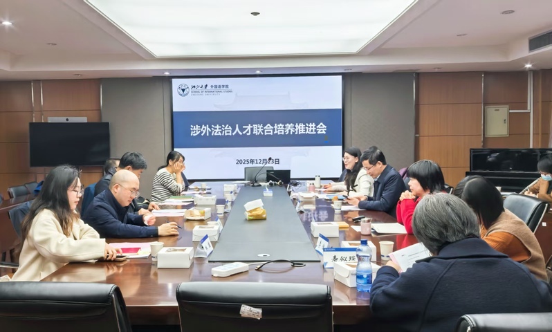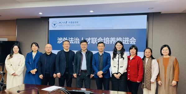 为进一步深入贯彻国家战略,全面赋能涉外法治人才培养,2025年12月23日下午,涉外法治人才联合培养推进会在外国语学院东5-201会议室顺利举行。法学院院长胡铭、求是学院常务副院长赵骏、副院长郑磊,外国语学院院长屈文生、副院长滕琳、英文系主任方凡、英文系副主任孙艳萍与寿似琛、国际组织基层教学组织负责人李佳、双方教学科工作人员等参加会议。会议由外国语学院副院长滕琳主持。