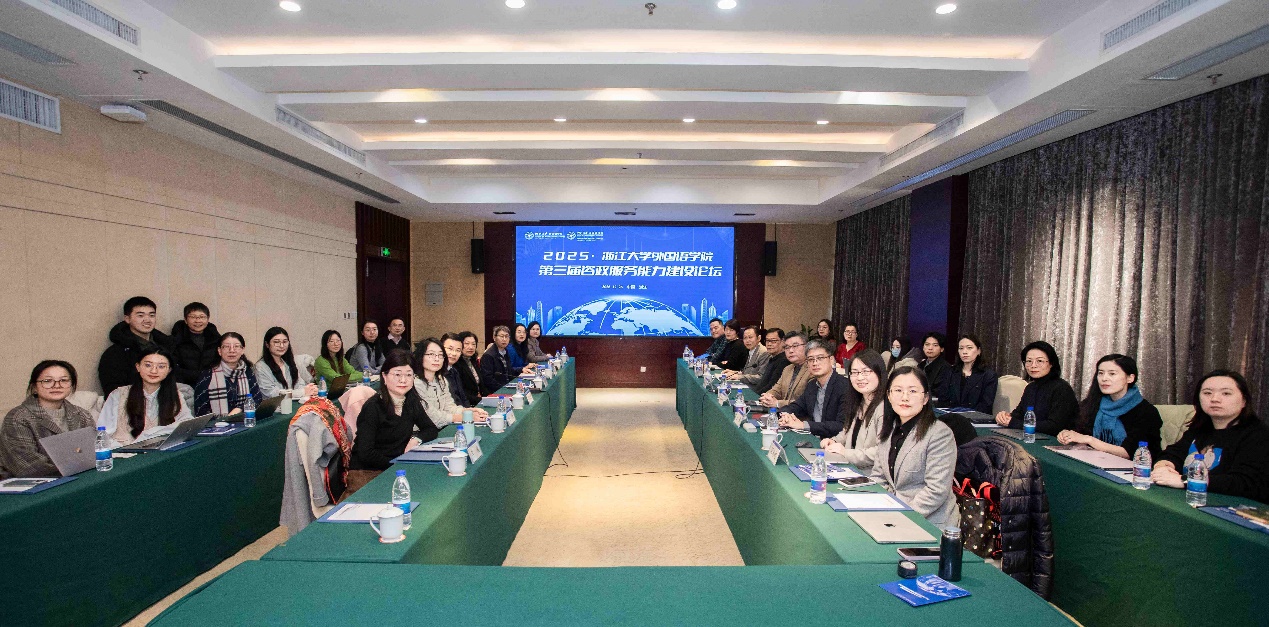 2025年12月26日上午,浙江大学外国语学院第三届咨政服务能力建设论坛在浙江大学紫金港校区隆重召开。本届论坛聚焦"法国与欧洲研究",特邀天津大学王战教授、北京外国语大学崔洪建教授、王朔教授、浙江大学谢贵平教授、何莲珍教授等学界专家齐聚一堂,共话学术研究与咨政服务发展。