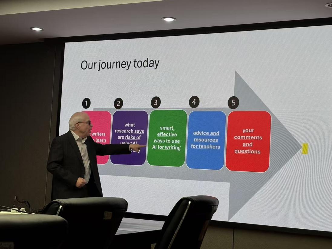 讲座期间,Hughes教授通过写作核心素养、AI使用风险及策略等多个维度,深入浅出地阐述了人工智能在写作实践与写作教学中的融合路径。讲座内容包含三个主要部分:首先,他通过现场拆解国际权威期刊论文中的引言与文献综述部分,直观展示了写作核心素养如何具体转化为清晰的论证、严谨的文本结构与高效的信息传达,为与会师生提供了实用的写作指导。其后,Hughes教授以“24小时待命的助手”为喻,深入浅出地阐释了生成式人工智能作为变革性工具的特性。基于对此特性的理解,他进而