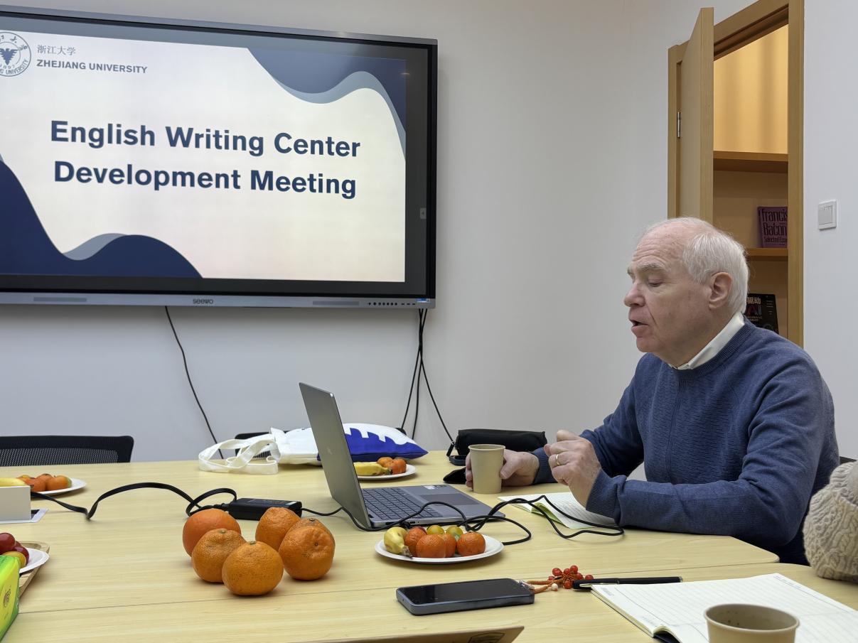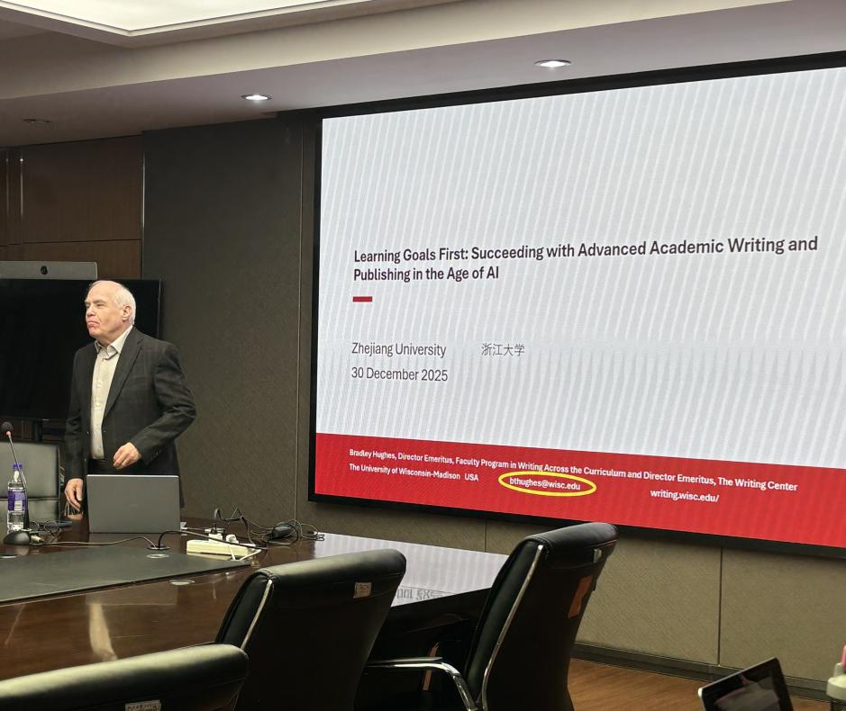 为进一步推动数字化时代下学术写作课程体系建设,助力跨学科写作项目的构建,探讨英文写作教学研究中心(下称英文写作中心)的未来发展策略,2025年12月28日至2026年1月1日,美国威斯康星大学麦迪逊分校(University of Wisconsin - Madison)写作中心荣休主任Bradley Hughes教授受邀来访浙江大学英文写作中心。