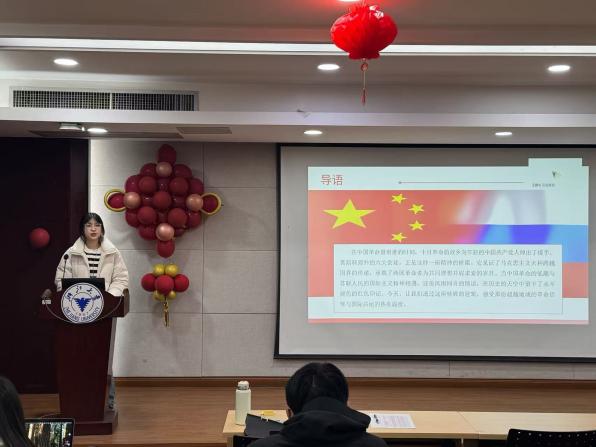 随后,在“语世界——红色故事我来讲”中,支部备课组俄语组王柳兮同志以“莫斯科郊外:中共六大会址的前生和今世”为主题进行专题分享。她生动讲述了1928年中共六大在莫斯科郊外秘密召开的历史背景与重大意义,揭示了在革命低潮时期,中国共产党人远赴异国探寻真理的艰辛以及中苏人民同舟共济的情谊。本次活动以专业语言为桥梁,将党史学习与学科特色深度融合,使参与同学在提升语言应用能力的同时,进一步筑牢了理想信念,深化了对党的奋斗历程与国际共产主义精神的理解。